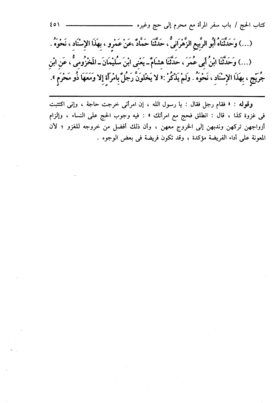 (...) وَحَدَّثَنَا ابْنُ أَبِى عُمَرَ، حَدَّثَنَا هِشَامٌ - يَعْنِى ابْنَ سُليْمَانَ - المَخْزُومِىِّ، عَنِ ابْنِ جُرَيْجٍ، بِهَذَا الإِسْنَادِ، نَحْوَهُ. وَلمْ يَذْكُرْ: " لا يَخْلوَنَّ رَجُلٌ بِامْرَأَةٍ إِلا وَمَعَهَا ذُو مَحْرَمٍ ".