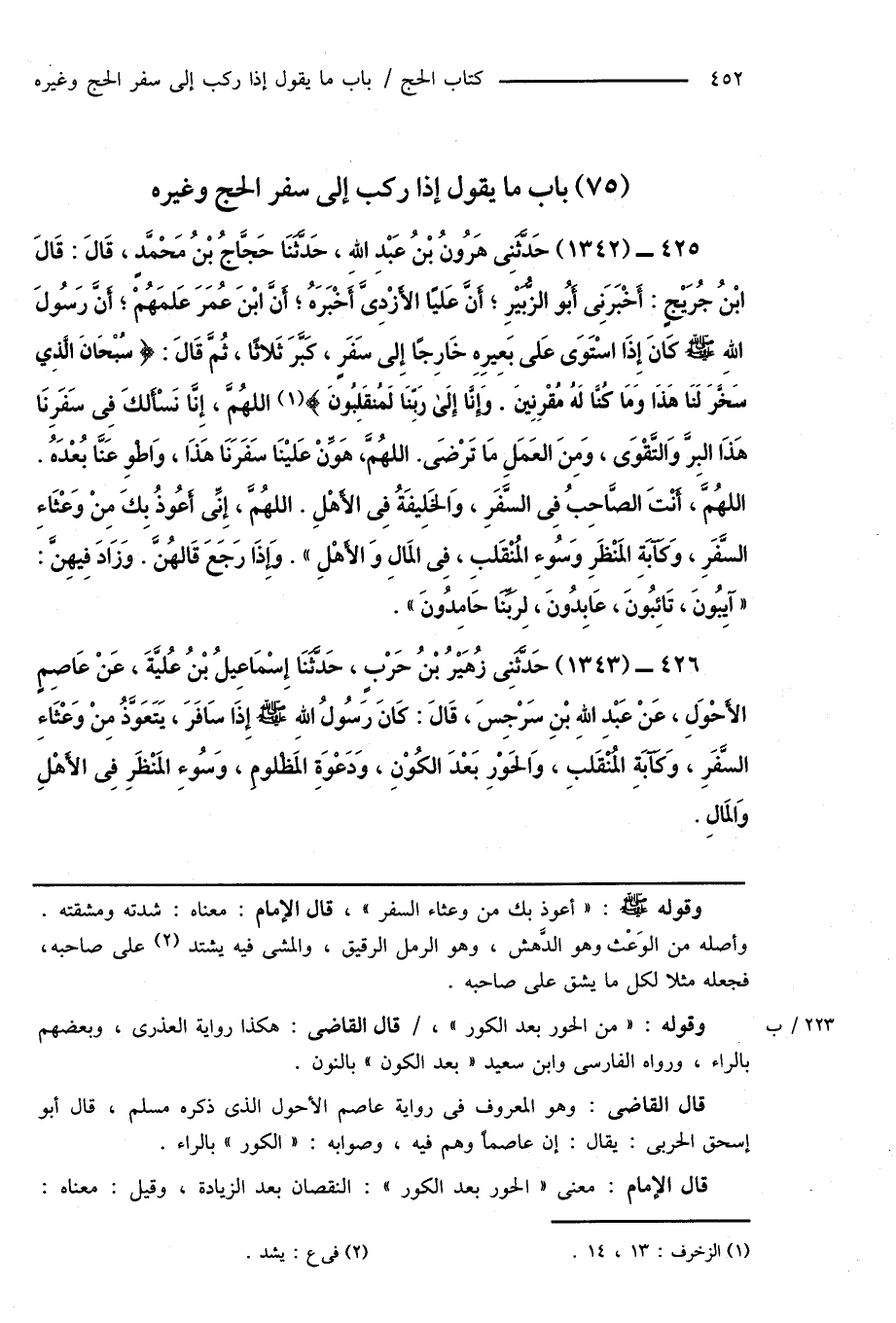 425 - (1342) حَدَّثَنِى هَارُونُ بْنُ عَبْدِ اللهِ، حَدَّثَنَا حَجَّاجُ بْنُ مَحْمَّدٍ، قَالَ: قَالَ ابْنُ جُرَيْجٍ: أَخْبَرَنِى أَبُو الزُّبَيْرِ؛ أَنَّ عَليًا الأَزْدِىَّ أَخْبَرَهُ؛ أَنَّ ابْنَ عُمَرَ عَلمَهُمْ؛ أَنَّ رَسُولَ اللهِ صَلَّى اللهُ عَلَيْهِ وَسَلَّمَ كَانَ إِذَا اسْتَوَى عَلى بَعِيرِهِ خَارِجًا إِلَى سَفَرٍ، كَبَّرَ ثَلَاثًا، ثُمَّ قَالَ: {سُبْحَانَ الَّذِي سَخَرَ لَنَا هَذَا وَمَا كُنَّا لَهُ مُقْرِنِينَ. وَإِنَّا إِلَى رَبِّنَا لَمُنقَلِبُونَ} (¬1) اللهُمَّ، إِنَّا نَسْأَلكَ فِى سَفَرِنَا هَذَا البِرَّ وَالتَّقْوَى، وَمِنَ العَمَلِ مَا تَرْضَى. اللهُمَّ، هَوِّنْ عَلَيْنَا سَفَرَنَا هَذَا، وَاطْوِ عَنَّا بُعْدَهُ. اللهُمَّ، أَنْتَ الصَّاحِبُ فِى السَّفَرِ، وَالخَلِيفَةُ فِى الأَهْلِ. اللَّهُمَّ، إِنِّى أَعُوذُ بِكَ مِنْ وَعْثَاءِ السَّفَرِ، وَكَآبَةِ المَنْظَرِ وَسُوءِ المُنْقَلبِ، فِى المَالِ وَالأَهْلِ ". وَإِذَا رَجَعَ قَالهُنَّ. وَزَادَ فِيهِنَّ: " آيِبُونَ، تَائِبُونَ، عَابِدُونَ، لِرَبِّنَا حَامِدُونَ ".