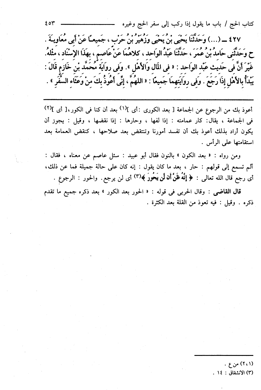 427 - (...) وَحَدَّثَنَا يَحْيَى بْنُ يَحْيَى وَزُهَيْرُ بْنُ حَرْبٍ، جَمِيعًا عَنْ أَبِى مُعَاوِيَةَ. ح وَحَدَّثَنِى حَامِدُ بْنُ عُمَرَ، حَدَّثَنَا عَبْدُ الوَاحِدِ، كِلاهُمَا عَنْ عَاصِمٍ، بِهَذَا الإِسْنَادِ، مِثْلهُ. غَيْرَ أَنَّ فِى حَدِيثِ عَبْدِ الوَاحِدِ: " فِى المَالِ وَالأَهْلِ ". وَفِى رِوَايَةِ مُحَمَّدِ بْنِ خَازمٍ قَالَ: يَبْدَأُ بِالأَهْلِ إِذَا رَجَعَ. وَفِى رِوَاَيَتِهِمَا جَمِيعًا: " اللَّهُمَّ، إِنِّى أَعُوذُ بِكَ مِنْ وَعَثَاءِ السَّفَرِ ".