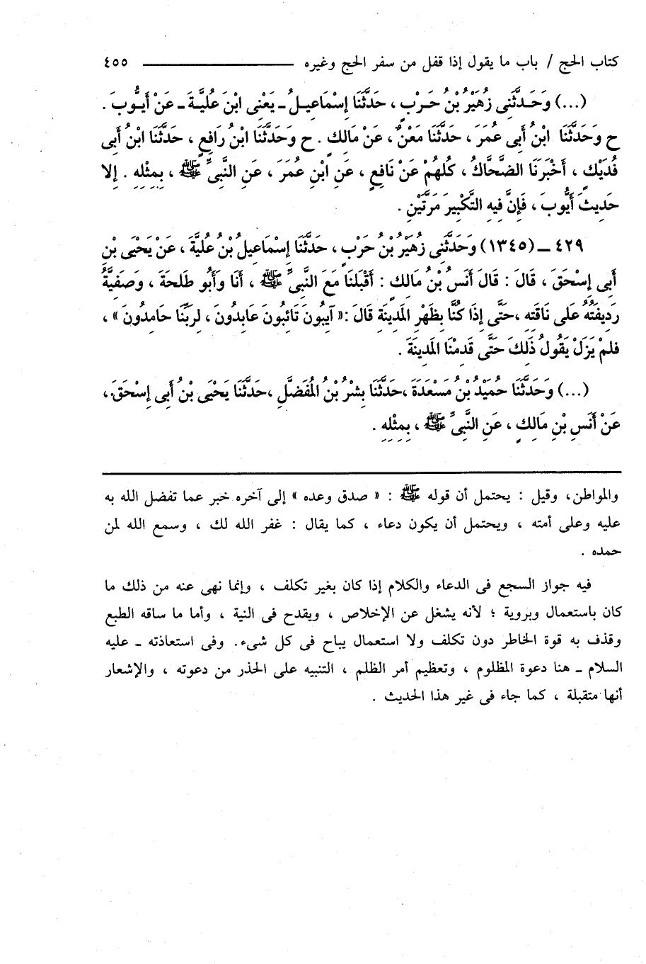 429 - (1345) وَحَدَّثَنِى زُهَيْرُ بْنُ حَرْبٍ، حَدَّثَنَا إِسْمَاعِيلُ بْنُ عُليَّةَ، عَنْ يَحْيَى بْنِ أَبِى إِسْحَاقَ، قَالَ: قَالَ أَنَسُ بْنُ مَالِكٍ: أَقْبَلنَا مَعَ النَّبِىِّ صَلَّى اللهُ عَلَيْهِ وَسَلَّمَ، أَنَا وَأَبُو طَلْحَةَ، وَصَفِيَّةُ رَدِيفَتُهُ عَلى نَاقَتِهِ، حَتَّى إِذَا كُنَّا بِظَهْرِ المَدِينَةِ قَالَ: " آيِبُونَ تَائِبُونَ عَابِدُونَ، لِرَبِّنَا حَامِدُونَ "، فلَمْ يَزَلْ يَقُولُ ذَلِكَ حَتَّى قَدِمْنَا المَدِينَةَ.