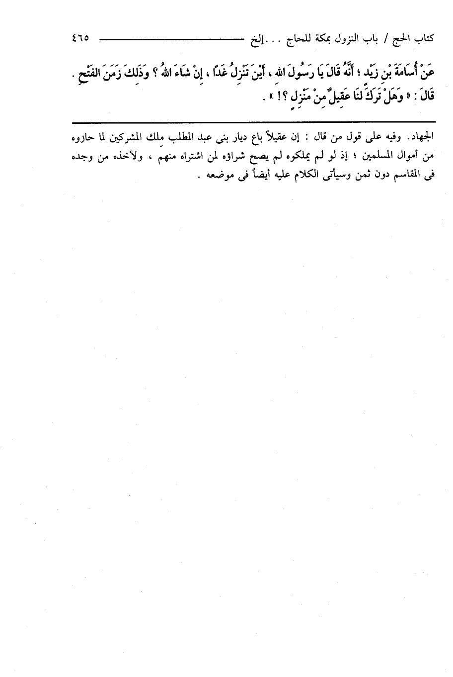 عَنْ أُسَامَةَ بْنِ زَيْدٍ؛ أَنَّهُ قَالَ يَا رَسُولَ اللهِ، أَيْنَ تَنْزِلُ غَدًا، إِنْ شَاءَ اللهُ؟ وَذَلِكَ زَمَنَ الفَتْحِ. قَالَ: " وَهَلْ تَرَكَ لَنَا عَقِيلٌ مِنْ مَنْزِلٍ؟! ".