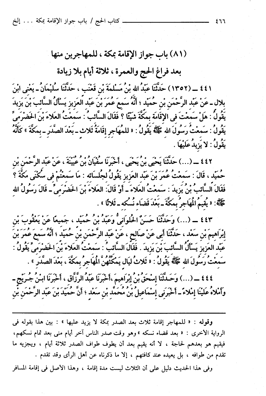 442 - (...) حَدَّثَنَا يَحْيَى بْنُ يَحْيَى، أَخْبَرَنَا سُفْيَانُ بْنُ عُيَيْنَةَ، عَنْ عَبْدِ الرَّحْمَنِ بْنِ حُمَيْدٍ، قَالَ: سَمِعْتُ عُمَرَ بْنَ عَبْدِ الْعَزِيزِ يَقُولُ لِجُلسَائِهِ: مَا سَمِعْتُمْ فِى سُكْنَى مَكَّةَ؟ فَقَالَ السَّائِبُ بْنُ يَزِيدَ: سَمِعْتُ العَلاءَ - أَوْ قَالَ. العَلاءَ بْنَ الحَضْرَمِىِّ - قَالَ رَسُولُ اللهِ صَلَّى اللهُ عَلَيْهِ وَسَلَّمَ: " يُقِيمُ المُهَاجِرُ بِمَكَّةَ - بَعْدَ قَضَاءِ نُسُكِهِ - ثَلَاثًا ".