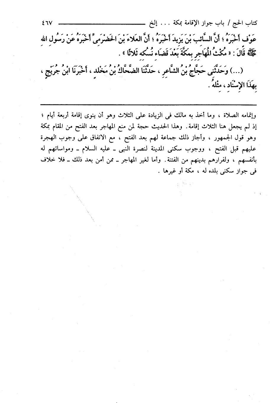 وإتمامه الصلاة، وما أخذ به مالك فى الزيادة على الثلاث وهو أن ينوى إقامة أربعة أيام؛ إذ لم يجعل هنا الثلاث إقامة. وهذا الحديث حجة لمن منع المهاجر بعد الفتح من المقام بمكة وهو قول الجمهور، وأجاز ذلك جماعة لهم بعد الفتح، مع الاتفاق على وجوب الهجرة عليهم قبل الفتح، ووجوب سكنى المدينة لنصرة النبى - عليه السلام - ومواساتهم له بأنفسهم، ولفرارهم بدينهم من الفتنة. وأما لغير المهاجر - ممن أمن بعد ذلك - فلا خلاف فى جواز سكنى بلده له، مكة أو غيرها.