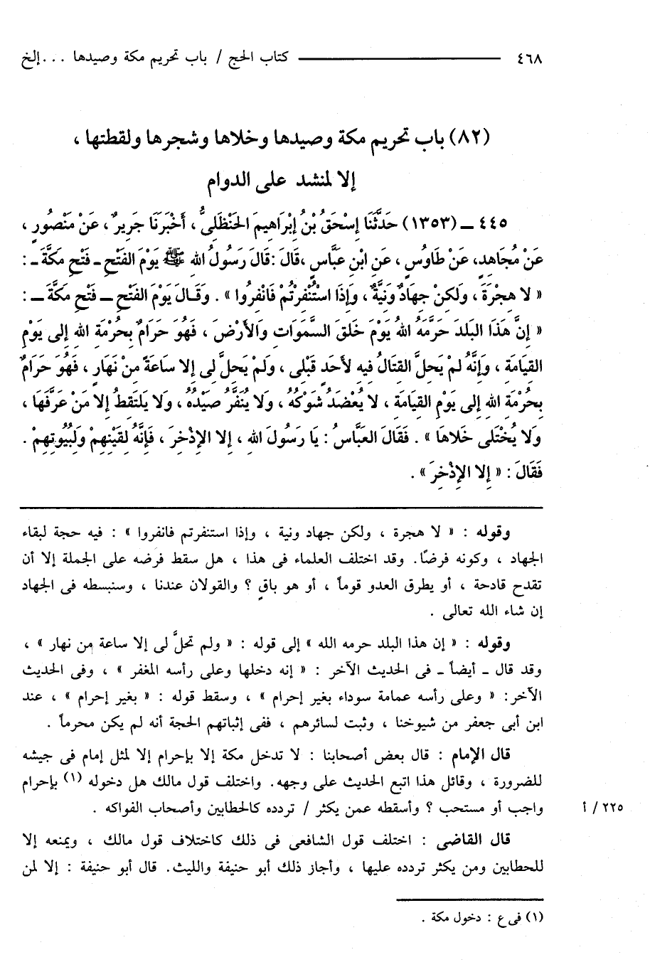 445 - (1353) حَدَّثَنَا إِسْحَاقُ بْنُ إِبْرَاهِيمَ الحَنْظَلِىُّ، أَخْبَرَنَا جَرِيرٌ، عَنْ مَنْصُورٍ، عَنْ مُجَاهِدٍ، عَنْ طَاوُسٍ، عَنِ ابْنِ عَبَّاسٍ، قَالَ: قَالَ رَسُولُ اللهِ صَلَّى اللهُ عَلَيْهِ وَسَلَّمَ يَوْمَ الفَتْحِ - فَتْحِ مَكَّةَ -: " لا هِجْرَةَ، وَلكِنْ جِهَادٌ وَنِيَّةٌ، وَإِذَا اسْتنفِرْتُمْ فَانْفِرُوا ". وَقَالَ يَوْمَ الفَتْحِ - فَتْحِ مَكَّةَ -: " إِنَّ هَذَا البَلدَ حَرَّمَهُ اللهُ يَوْمَ خَلقَ السَّمَاوَاتِ وَالأَرْضَ، فَهُوَ حَرَامٌ بِحُرْمَةِ اللهِ إِلَى يَوْمِ القِيَامَةِ، وَإنَّهُ لمْ يَحِلَّ القِتَالُ فِيهِ لأَحَدٍ قَبْلِى، وَلمْ يَحِلَّ لِى إِلا سَاعَةً مِنْ نَهَارٍ، فَهُوَ حَرَامٌ بِحُرْمَةِ اللهِ إِلَى يَوْمِ القِيَامَةِ، لا يُعْضَدُ شَوْكُهُ، وَلا يُنَفَّرُ صَيْدُهُ، وَلا يَلتَقِطُ إِلا مَنْ عَرَّفَهَا، وَلا يُخْتَلى خَلاهَا ". فَقَالَ العَبَّاسُ: يَا رَسُولَ اللهِ، إِلا الإِذْخِرَ، فَإِنَّهُ لِقَيْنِهِمْ وَلِبُيُوتِهِمْ. فَقَالَ: " إِلا الإِذْخِرَ ".