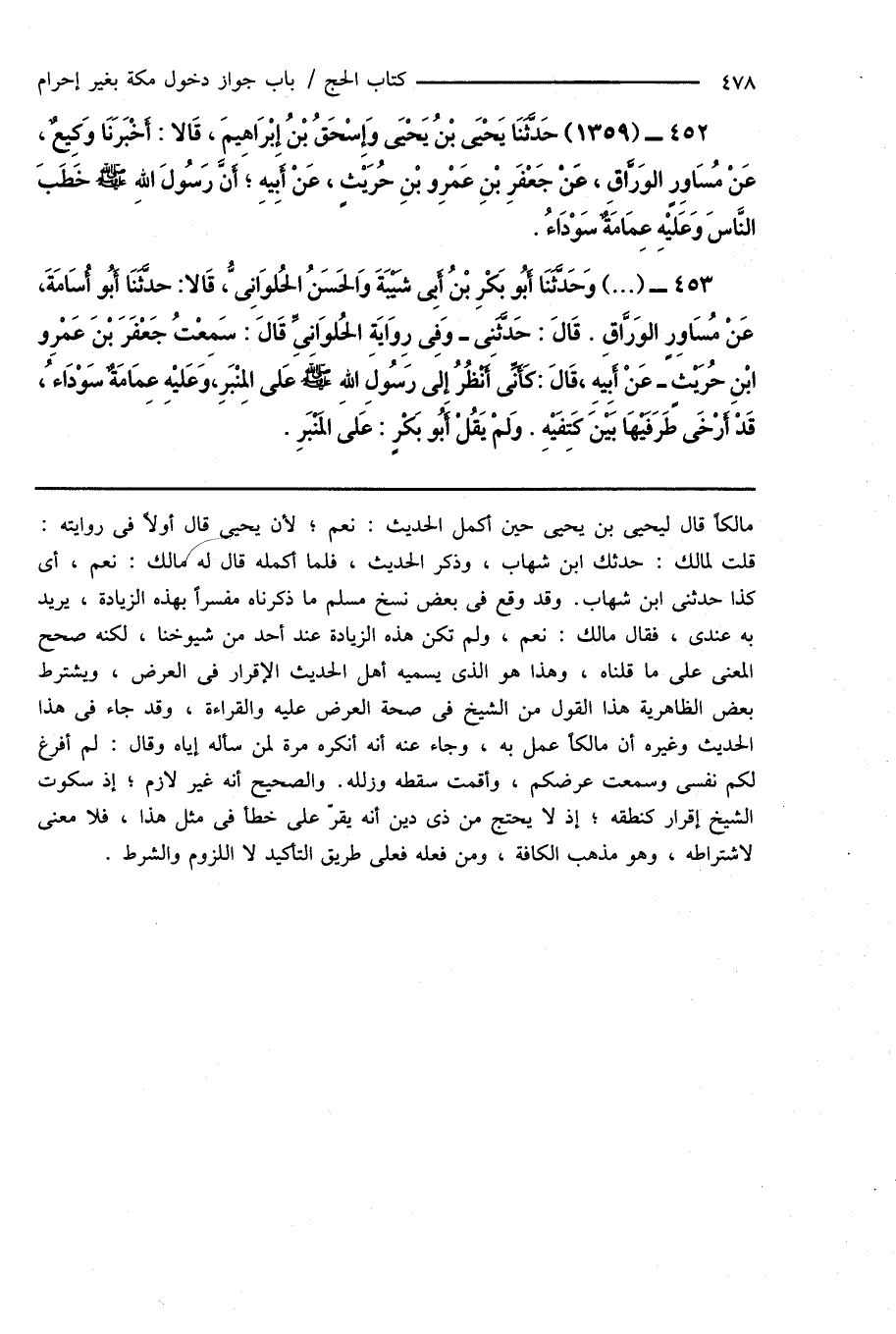 452 - (1359) حَدَّثَنَا يَحْيَى بْنُ يَحْيَى وَإِسْحَاقُ بْنُ إِبْرَاهِيمَ، قَالا: أَخْبَرَنَا وَكِيعٌ، عَنْ مُسَاوِرٍ الوَرَّاقِ، عَنْ جَعْفَرِ بْنِ عَمْرِو بْنِ حُرَيْثٍ، عَنْ أَبِيهِ؛ أَنَّ رَسُولَ اللهِ صَلَّى اللهُ عَلَيْهِ وَسَلَّمَ خَطَبَ النَّاسَ وَعَليْهِ عِمَامَةٌ سَوْدَاءُ.