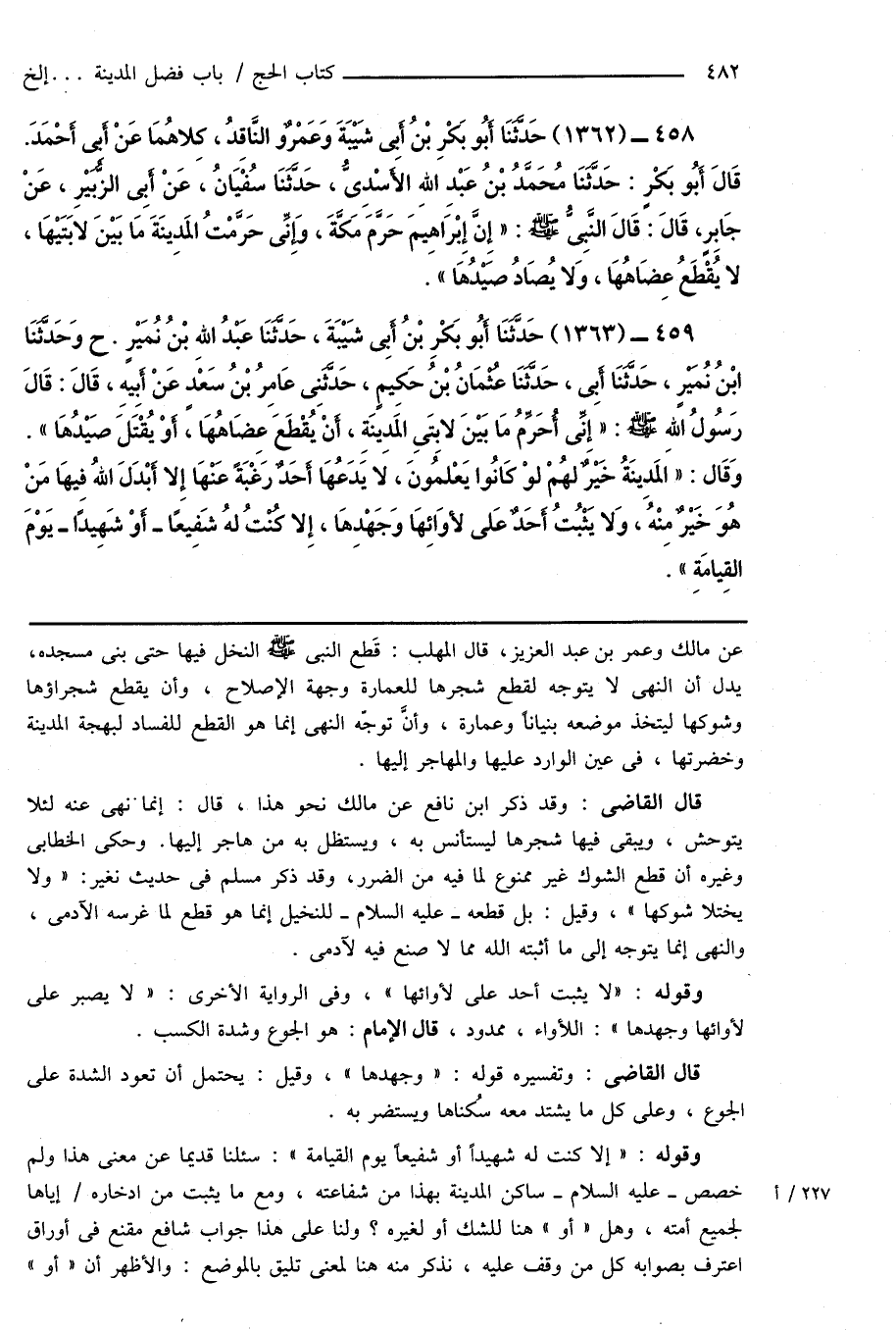 459 - (1363) حَدَّثَنَا أَبُو بَكْرِ بْنُ أَبِى شَيْبَةَ، حَدَّثَنَا عَبْدُ اللهِ بْنُ نُمَيْرٍ. ح وَحَدَّثَنَا ابْنُ نُمَيْرٍ، حَدَّثَنَا أَبِى، حَدَّثَنَا عُثْمَانُ بْنُ حَكِيمٍ، حَدَّثَنِى عَامِرُ بْنُ سَعْدٍ عَنْ أَبِيهِ، قَالَ: قَالَ رَسُولُ اللهِ صَلَّى اللهُ عَلَيْهِ وَسَلَّمَ: " إِنِّى أُحَرِّمُ مَا بَيْنَ لابِتَىِ المَدِينَةِ، أَنْ يُقْطَعَ عِضَاهُهَا، أَوْ يُقْتَلَ صَيْدُهَا ". وَقَال: " المَدِينَةُ خَيْرٌ لهُمْ لوْ كَانُوا يَعْلمُونَ، لَا يَدَعُهَا أَحَدٌ رَغْبَةً عَنْهَا إِلا أَبْدَلَ اللهُ فِيهَا مَنْ هُوَ خَيْرٌ مِنْهُ، وَلا يَثْبُتُ أَحَدٌ عَلى لأَوَائِهَا وَجَهْدِهَا، إِلا كُنْتُ لهُ شَفِيعًا - أَوْ شَهِيدًا - يَوْمَ القِيامَةِ ".