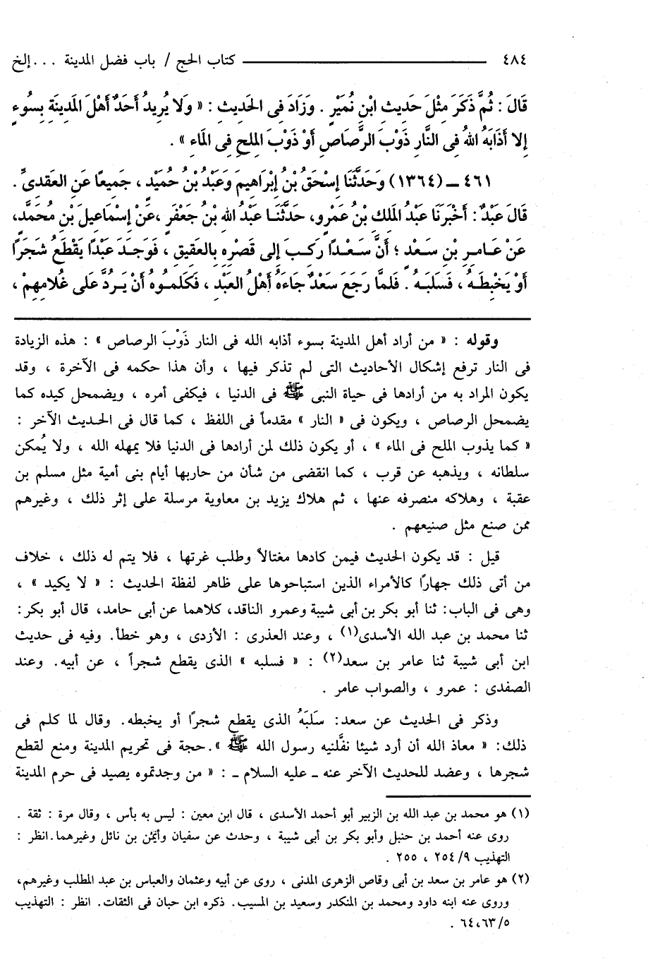 قيل: قد يكون الحديث فيمن كادها مغتالاً وطلب غرتها، فلا يتم له ذلك، خلاف من أتى ذلك جهارًا كالأمراء الذين استباحوها على ظاهر لفظة الحديث: " لا يكيد "، وهى فى الباب: ثنا أبو بكر بن أبى شيبة وعمرو الناقد، كلاهما عن أبى حامد، قال أبو بكر: ثنا محمد بن عبد الله الأسدى (¬1)، وعند العذرى: الأزدى، وهو خطأ. وفيه فى حديث ابن أبى شيبة ثنا عامر بن سعد (¬2): " فسلبه " الذى يقطع شجراً، عن أبيه. وعند الصفدى: عمرو، والصواب عامر.