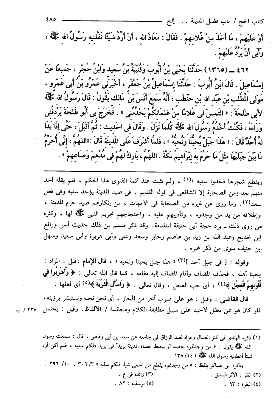 462 - (1365) حَدَّثَنَا يَحْيَى بْنُ أَيُّوبَ وَقُتَيْبَةُ بْنُ سَعِيدٍ وَابْنُ حُجْرٍ، جَمِيعًا عَنْ إِسْمَاعِيلَ. قَالَ ابْنُ أَيُّوبَ: حَدَّثَنَا إِسْمَاعِيلُ بْنُ جَعْفَرٍ، أَخْبَرَنِى عَمْرُو بْن أَبِى عَمْرٍو، مَوْلى المُطَّلِبِ بْنِ عَبْدِ اللهِ بْنِ حَنْطَبٍ؛ أَنَّهُ سَمِعَ أَنَسَ بْنَ مَالِكٍ يَقُولُ: قَالَ رَسُولُ اللهِ صَلَّى اللهُ عَلَيْهِ وَسَلَّمَ لأَبِى طَلْحَةَ: " التَمِس لِى غُلامًا مِنْ غِلْمَانِكُمْ يَخْدُمُنِى ". فَخَرَجَ بِى أَبُو طَلْحَةَ يَرْدِفُنِى وَرَاءَهُ، فَكُنْتُ أَخْدُمُ رَسُولَ اللهِ صَلَّى اللهُ عَلَيْهِ وَسَلَّمَ كُلمَا نَزَلَ. وَقَالَ فِى الحَدِيثِ: ثُمَّ أَقَبَلَ، حَتَّى إِذَا بَدَا لهُ أُحُدٌ قَالَ: " هَذَا جَبَلٌ يُحِبُّنَا وَنُحِبُّهُ "، فَلمَّا أَشْرَفَ عَلى المَدِينَةِ قَالَ: " اللهُمَّ، إِنِّى أُحَرِّمُ مَا بَيْنَ جَبَليْهَا مِثْلَ مَا حَرَّمَ بِهِ إِبْرَاهِيمُ مَكَّةَ. اللهُمَّ، بَارِكْ لهُمْ فِى مُدِّهِمْ وَصَاعِهِمْ ".