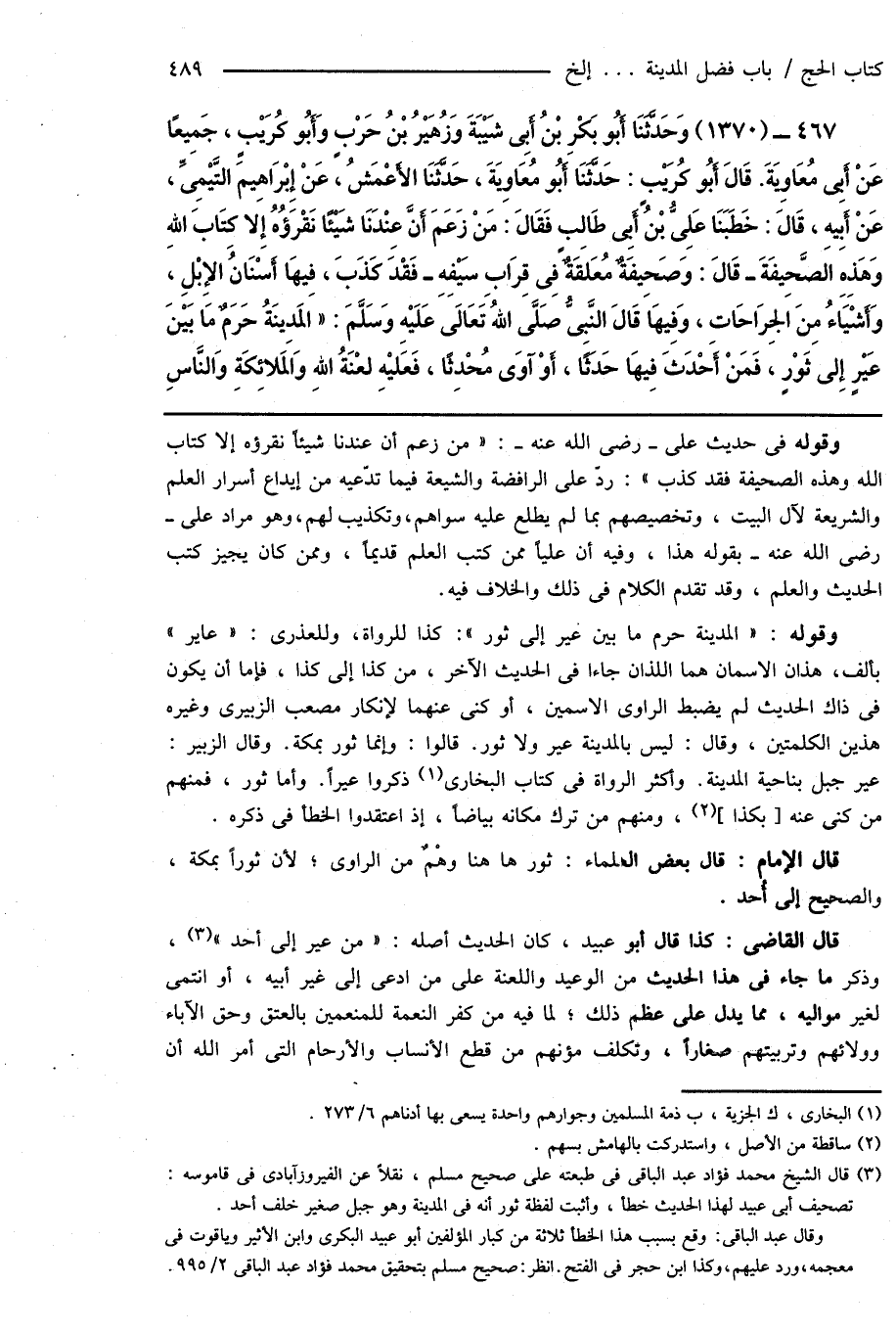 (¬3) قال الشيخ محمد فؤاد عبد الباقى فى طبعته على صحيح مسلم، نقلاً عن الفيروزآبادى فى قاموسه: تصحيف أبى عبيد لهذا الحديث خطأ، وأثبت لفظة ثور أنه فى المدينة وهو جبل صغير خلف أحد.