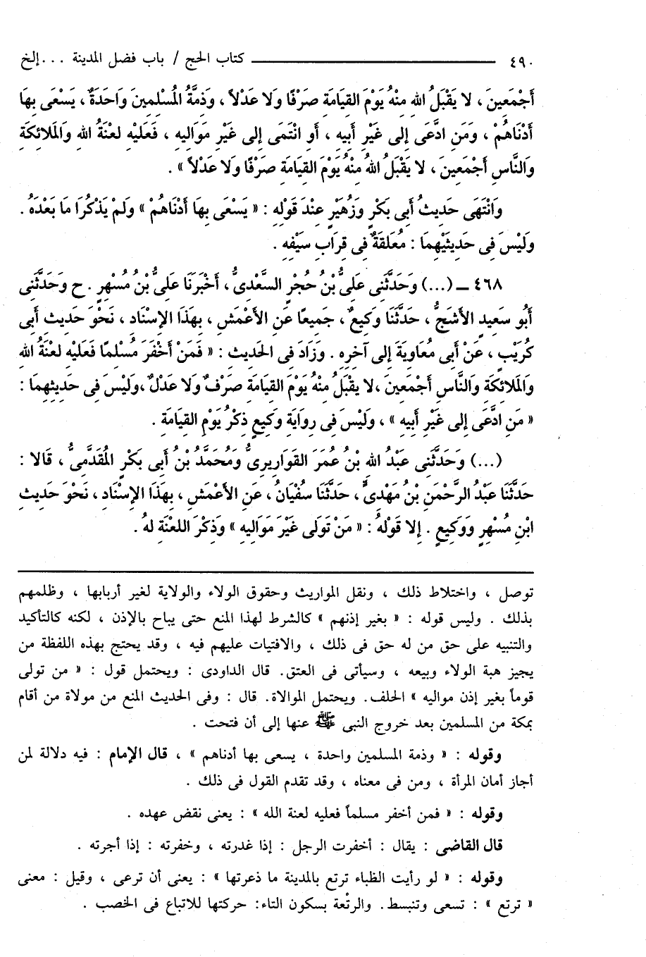 468 - (...) وَحَدَّثَنِى عَلى بْنُ حُجْرٍ السَّعْدِىُّ، أَخْبَرَنَا عَلِىُّ بْنُ مُسْهِرٍ. ح وَحَدَّثَنِى أَبُو سَعِيدٍ الأَشَجُّ، حَدَّثَنَا وَكِيعٌ، جَمِيعًا عَنِ الأَعْمَشِ، بِهَذَا الإِسْنَادِ، نَحْوَ حَدِيثِ أَبِى كُرَيْبٍ، عَنْ أَبِى مُعَاوِيَةَ إِلَى آخِرِهِ. وَزَادَ فِى الحَدِيثِ: " فَمَنْ أَخْفَرَ مُسْلِمًا فَعَليْهِ لعْنَةُ اللهِ وَالمَلائِكَةِ وَالنَّاسِ أَجْمَعِينَ، لا يقْبَلُ مِنْهُ يَوْمَ القِيَامَةِ صَرْفٌ وَلا عَدْلٌ، وَلَيْسَ فِى حَدِيثِهِمَا: " مَنِ ادَّعَى إِلَى غَيْرِ أَبِيهِ "، وَلَيْسَ فِى رِوَايَةِ وَكِيعٍ ذِكْرُ يَوْمِ القِيَامَةِ.