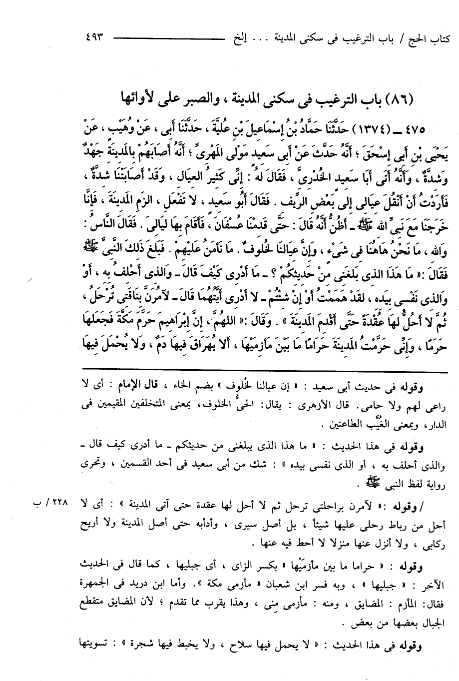 475 - (1374) حَدَّثَنَا حَمَّادُ بْنُ إِسْمَاعِيلَ بْنِ عُليَّةَ، حَدَّثَنَا أَبِى، عَنْ وُهَيْبٍ، عَنْ يَحْيَى بْنِ أَبِى إِسْحَاقَ؛ أَنَّهُ حَدَّثَ عَنْ أَبِى سَعِيدٍ مَوْلى المَهْرِىِّ؛ أَنَّهُ أَصَابَهُمْ بِالمَدِينَةِ جَهْدٌ وَشِدَّةٌ، وَأَنَّهُ أَتَى أَبَا سَعِيدٍ الخُدْرِىِّ، فَقَالَ لهُ: إِنِّى كَثِيرُ العِيَالِ، وَقَدْ أَصَابَتْنَا شِدَّةٌ، فَأَرَدْتُ أَنْ أَنْقُلَ عِيَالِى إِلى بَعْضِ الرِّيفِ. فَقَالَ أَبُو سَعِيدٍ، لَا تَفْعَلِ، الزَمِ المَدِينَةَ، فَإِنَّا خَرَجَنَا مَعَ نَبِىِّ اللهِ صَلَّى اللهُ عَلَيْهِ وَسَلَّمَ - أَظُنُّ أَنَّهُ قَالَ: حَتَّى قَدِمْنَا عُسْفَانَ، فَأَقَامَ بِهَا ليَالِىَ. فَقَالَ النَّاسُ: وَاللهِ، مَا نَحْنُ هَاهُنَا فِى شَىْءٍ، وَإِنَّ عِيَالنَا لخُلوفٌ. مَا نَأْمَنُ عَليْهِمْ. فَبَلغَ ذَلِكَ النَّبِىَّ صَلَّى اللهُ عَلَيْهِ وَسَلَّمَ فَقَالَ: " مَا هَذَا الذِى بَلغَنِى مِنْ حَدِيثِكُمْ؟ - مَا أَدْرِى كَيْفَ قَالَ - وَالذِى أَحْلِفُ بِهِ، أَوْ وَالذِى نَفْسِى بِيَدِهِ، لقَدْ هَمَمْتُ أَوْ إِنْ شِئْتُمْ - لا أَدْرِى أَيَّتُهُمَا قَالَ - لآمُرَنَّ بِنَاقَتِى تُرْحَلُ، ثُمَّ لَا أَحُلُّ لهَا عُقْدَةً حَتَّى أَقْدِمَ المَدِينَةَ ". وَقَالَ: " اللهُمَّ، إِنَّ إِبْرَاهِيمَ حَرَّم مَكَّةَ فَجَعَلهَا حَرَمًا، وَإِنِّى حَرَّمْتُ المَدِينَةَ حَرَامًا مَا بَيْنَ مَأزِمَيْهَا، أَلا يُهَرَاقَ فِيهَا دَمٌ، وَلا يُحْمَلَ فِيهَا