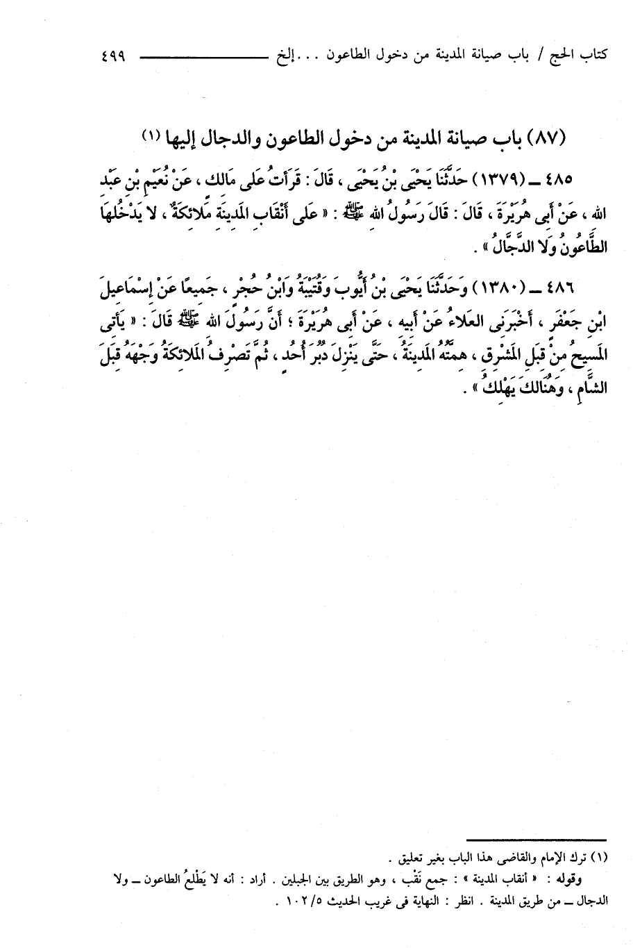 485 - (1379) حَدَّثَنَا يَحْيَى بْنُ يَحْيَى، قَالَ: قَرَأْتُ عَلى مَالِكٍ، عَنْ نُعَيْمِ بْنِ عَبْدِ اللهِ، عَنْ أَبِى هُرَيْرَةَ، قَالَ: قَالَ رَسُولُ اللهِ صَلَّى اللهُ عَلَيْهِ وَسَلَّمَ: " عَلى أَنْقَابِ المَدِينَةِ مَلائِكَةٌ، لا يَدْخُلهَا الطَّاعُونُ ولا الدَّجَّالُ ".