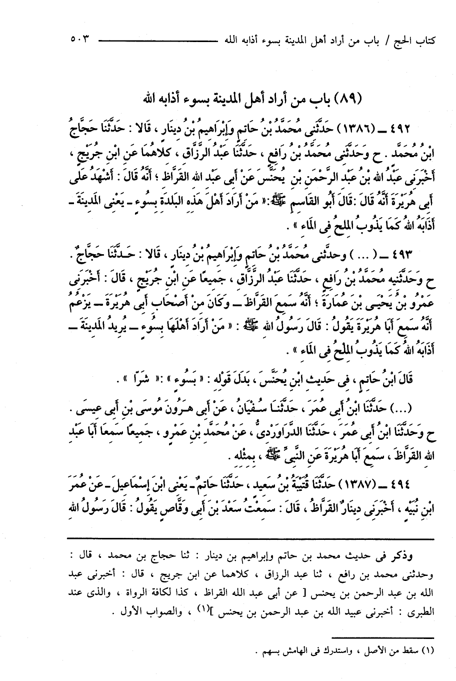 492 - (1386) حَدَّثَنِى مُحَمَّدُ بْنُ حَاتِمِ وَإِبْرَاهِيمُ بْنُ دِينَارٍ، قَالا: حَدَّثَنَا حَجَّاجُ ابْنُ مُحَمَّدٍ. ح وَحَدَّثَنِى مُحَمَّدُ بْنُ رَافِعٍ، حَدَّثَنَا عَبْدُ الرَّزَّاقِ، كِلاهُمَا عَنِ ابْنِ جُرَيْجٍ، أَخْبَرَنِى عَبدُ اللهِ بْنُ عَبْدِ الرَّحْمَنِ بْنِ يُحَنَّسَ عَنْ أَبِى عَبْدِ اللهِ القَرَّاظِ؛ أَنَّهُ قَالَ: أَشْهَدُ عَلى أَبِى هُرَيْرَةَ أَنَّهُ قَالَ: قَالَ أَبُو القَاسِمِ صَلَّى اللهُ عَلَيْهِ وَسَلَّمَ: " مَنْ أَرَادَ أَهْلَ هَذِهِ البَلدَةَ بِسُوءٍ - يَعْنِى المَدِينَةَ -