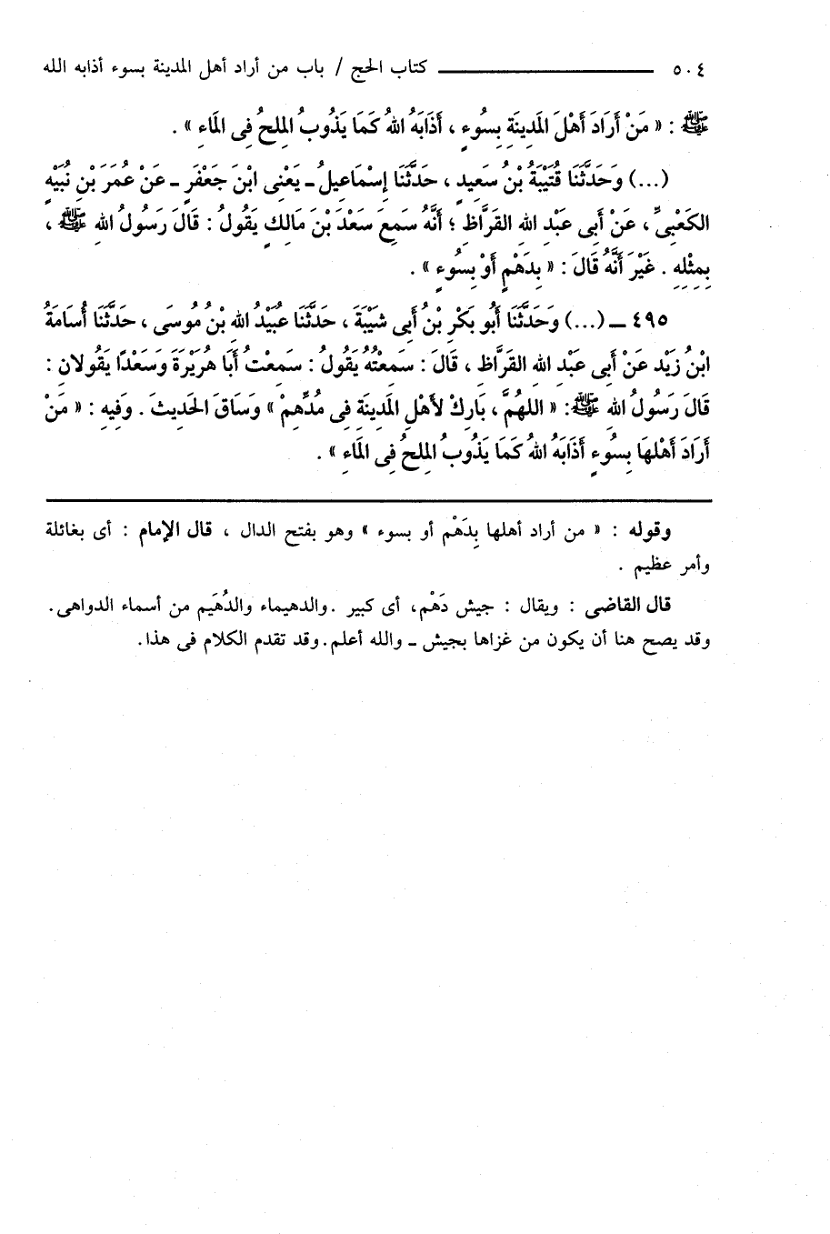 495 - (...) وَحَدَّثَنَا أَبُو بَكْرِ بْنُ أَبِى شَيْبَةَ، حَدَّثَنَا عُبَيْدُ اللهِ بْنُ مُوسَى، حَدَّثَنَا أُسَامَةُ ابْنُ زَيْدٍ عَنْ أَبِى عَبْدِ اللهِ القَرَّاظِ، قَالَ: سَمِعْتُهُ يَقُولُ: سَمِعْتُ أَبَا هُرَيْرَةَ وَسَعْدًا يَقُولانِ: قَالَ رَسُولُ اللهِ صَلَّى اللهُ عَلَيْهِ وَسَلَّمَ: " اللهُمَّ، بَارِكْ لأَهْلِ المَدِينَةِ فِى مُدِّهِمْ " وَسَاقَ الحَدِيثَ. وَفِيهِ: " مَنْ أَرَادَ أَهْلهَا بِسُوءٍ أَذَابَهُ اللهُ كَمَا يَذُوبُ المِلْحُ فِى المَاءِ ".