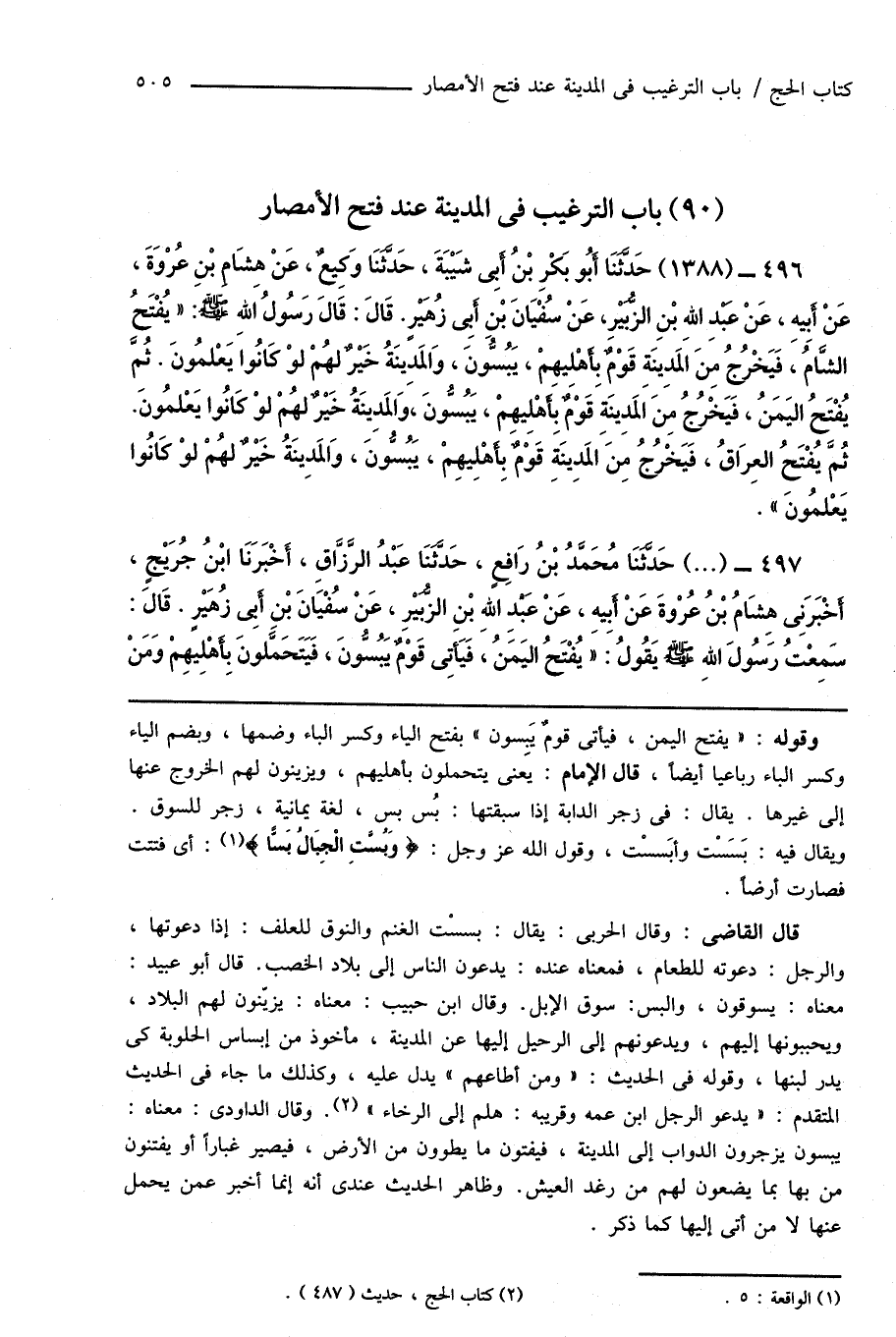 496 - (1388) حَدَّثَنَا أَبُو بَكْرِ بْنُ أَبِى شَيْبَةَ، حَدَّثَنَا وَكِيعٌ، عَنْ هِشَامِ بْنِ عُرْوَةَ، عَنْ أَبِيهِ، عَنْ عبدِ اللهِ بْنِ الزُّبَيْرِ، عَنْ سُفْيَانَ بْنِ أَبِى زُهَيْرٍ. قَالَ: قَالَ رَسُولُ اللهِ صَلَّى اللهُ عَلَيْهِ وَسَلَّمَ: " يُفْتَحُ الشَّامُ، فَيَخْرُجُ مِنَ المَدِينَةِ قَوْمٌ بِأَهْلِيهِمْ، يَبُسُّونَ، وَالمَدِينَةُ خَيْرٌ لهُمْ لوْ كَانُوا يَعْلمُونَ. ثُمَّ يُفْتَحُ اليَمَنُ، فَيَخْرُجُ مِنَ المَدِينَةِ قَوْمٌ بِأَهْلِيهِمْ، يَبُسُّونَ، وَالمَدِينَةُ خَيْرٌ لَهُمْ لوْ كَانُوا يَعْلمُونَ. ثُمَّ يُفْتَحُ العِرَاقُ، فَيَخْرُجُ مِنَ المَدِينَةِ قَوْمٌ بِأَهْلِيهِمْ، يَبُسُّونَ، وَالمَدِينَةُ خَيْرٌ لهُمْ لوْ كَانُوا يَعْلمُونَ ".