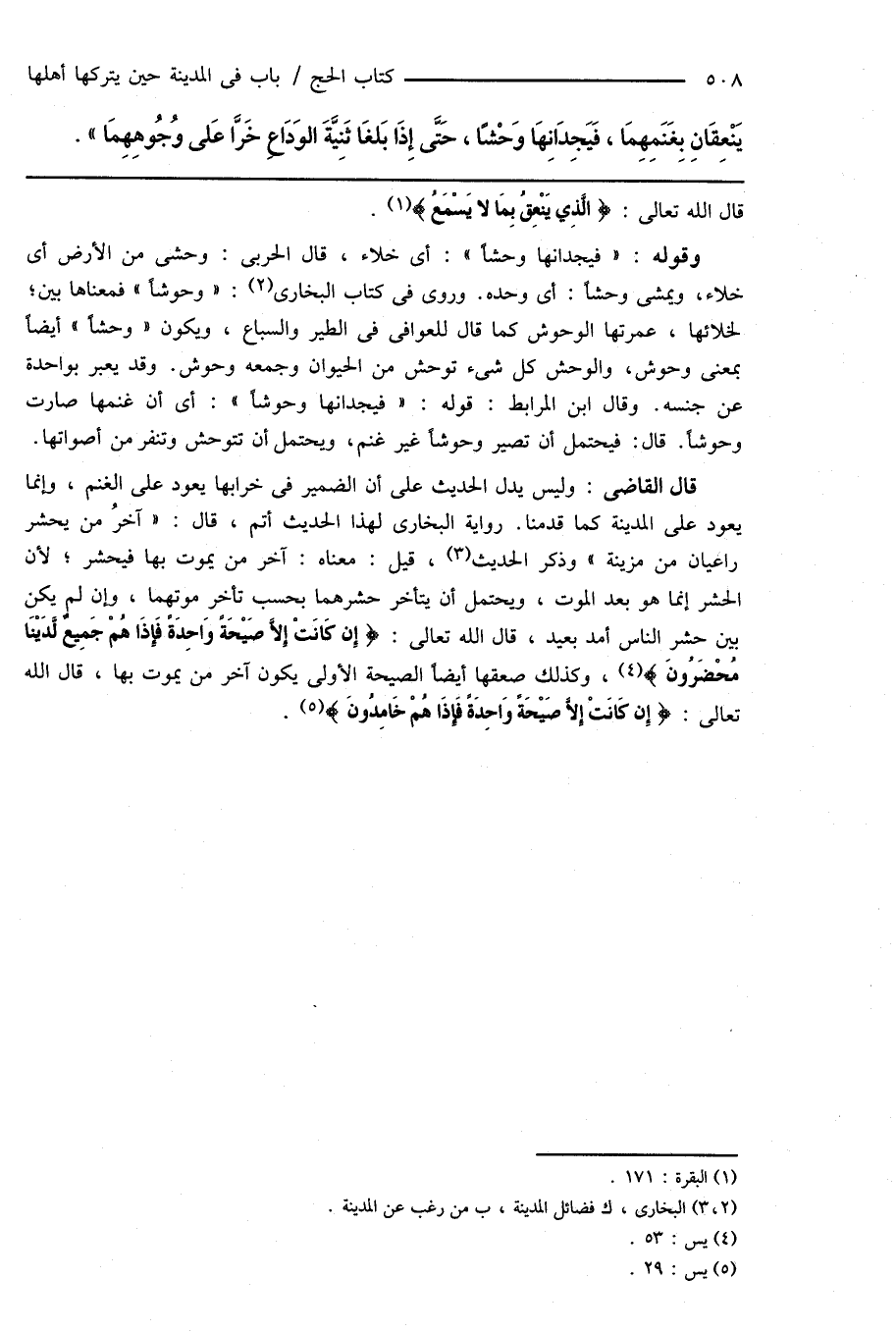 قال القاضى: وليس يدل الحديث على أن الضمير فى خرابها يعود على الغنم، وإنما يعود على المدينة كما قدمنا. رواية البخارى لهذا الحديث أتم، قال: " آخرُ من يحشر راعيان من مزينة " وذكر الحديث (¬3)، قيل: معناه: آخر من يموت بها فيحشر؛ لأن الحشر إنما هو بعد الموت، ويحتمل أن يتأخر حشرهما بحسب تأخر موتهما، وإن لم يكن بين حشر الناس أمد بعيد، قال الله تعالى: {إِن كَانَتْ إِلَّا صَيْحَةً وَاحِدَةً فَإِذَا هُمْ جَمِيعٌ لَدَيْنَا مُحْضَرُونَ} (¬4)، وكذلك صعقها أيضاً الصيحة الأولى يكون آخر من يموت بها، قال الله تعالى: {إن كَانَتْ إلَّا صَيْحَةً وَاحِدَةً فَإِذَا هُمْ خَامِدُونَ} (¬5).