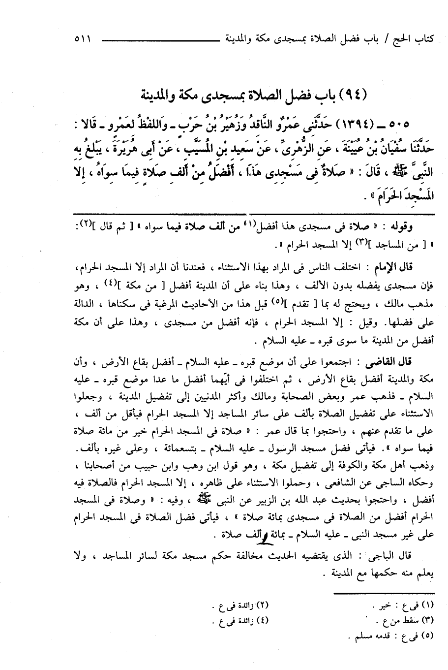 قال الباجى: الذى يقتضيه الحديث مخالفة حكم مسجد مكة لسائر المساجد، ولا يعلم منه حكمها مع المدينة.