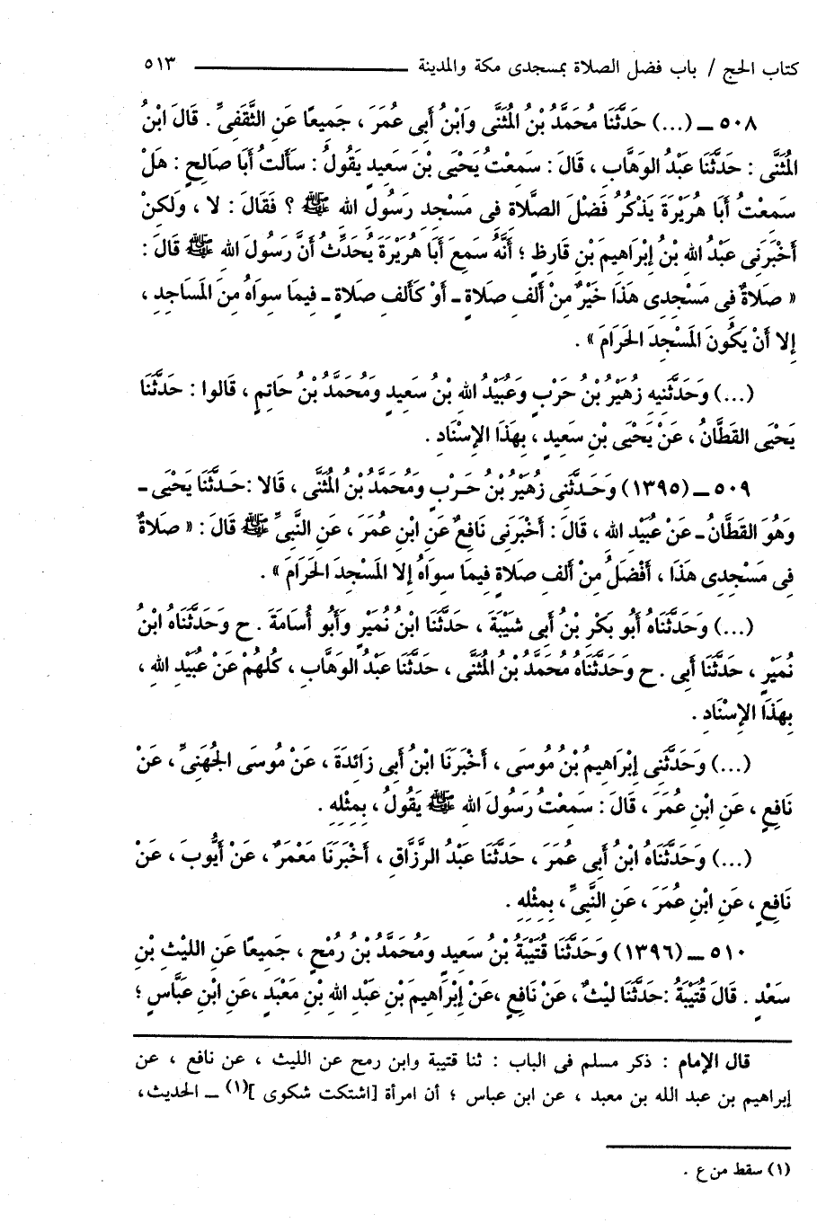 509 - (1395) وَحَدَّثَنِى زُهَيْرُ بْنُ حَرْبٍ وَمُحَمَّدُ بْنُ المُثَنَّى، قَالا: حَدَّثَنَا يَحْيَى - وَهُوَ القَطَّانُ - عَنْ عُبَيْدِ اللهِ، قَالَ: أَخْبَرَنِى نَافِعٌ عَنِ ابْنِ عُمَرَ، عَنِ النَّبِىِّ صَلَّى اللهُ عَلَيْهِ وَسَلَّمَ قَالَ: " صَلاةٌ فِى مَسْجِدِى هَذَا، أَفْضَلُ مِنْ أَلفِ صَلاةٍ فِيمَا سِوَاهُ إِلا المَسْجِدَ الحَرَامَ ".