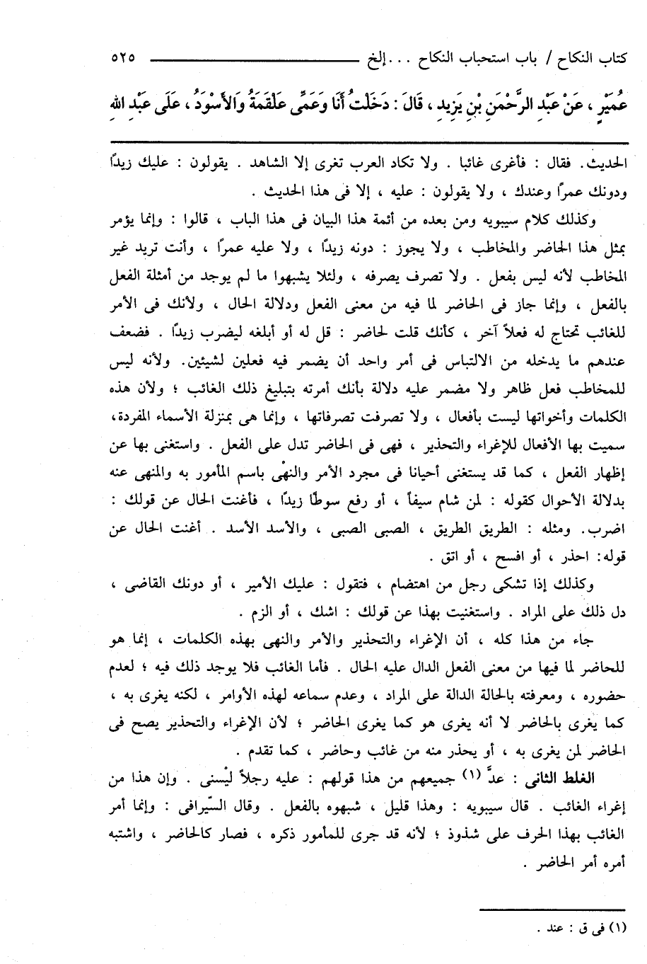 الغلط الثانى: عدَّ (¬1) جميعهم من هذا قولهم: عليه رجلاً ليْسنى. وإن هذا من إغراء الغائب. قال سيبويه: وهذا قليل، شبهوه بالفعل. وقال السّيرافى: وإنما أمر الغائب بهذا الحرف على شذوذ؛ لأنه قد جرى للمأمور ذكره، فصار كالحاضر، واشتبه أمره أمر الحاضر.