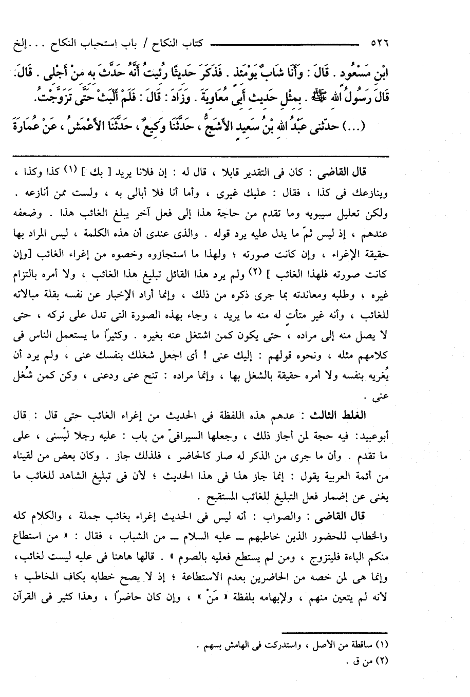 قال القاضى: والصواب: أنه ليس فى الحديث إغراء بغائب جملة، والكلام كله والخطاب للحضور الذين خاطبهم - عليه السلام - من الشباب، فقال: " من استطاع منكم الباءة فليتزوج، ومن لم يستطع فعليه بالصوم ". قالها هاهنا فى عليه ليست لغائب، وإنما هى لمن خصه من الحاضرين بعدم الاستطاعة؛ إذ لا يصح خطابه بكاف المخاطب؛ لأنه لم يتعين منهم، ولإبهامه بلفظة " مَنْ "، وإن كان حاضرًا، وهذا كثير فى القرآن