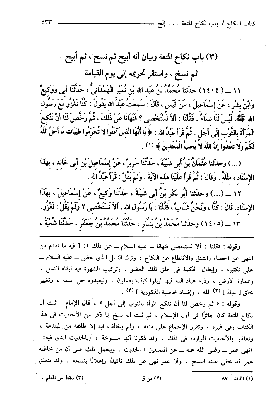 11 - (1404) حدَّثنا مُحَمَّدُ بْنُ عَبْدِ اللهِ بْنِ نُمَيْرٍ الْهَمْدَانِىُّ، حَدَّثَنَا أَبِى وَوَكِيعٌ وَابنُ بِشْرٍ، عَنْ إِسْمَاعِيلَ، عَنْ قيسٍ، قَالَ: سَمِعْتُ عَبدَ اللهِ يَقُولُ: كُنَّا نَغْزُو مَعَ رَسُولِ اللهِ صَلَّى اللهُ عَلَيْهِ وَسَلَّمَ، لَيْسَ لَنَا نِسَاءٌ. فَقُلْنَا: أَلا نَسْتَخْصِى؟ فَنَهَانَا عَنْ ذَلِكَ، ثُمَّ رَخَّصَ لَنَا أَنْ نَنْكِحَ الْمَرْأَةَ بِالثَّوْبِ إِلَى أَجَلٍ. ثُمَّ قَرَأَ عَبْدُ اللهِ: {يَا أَيُّهَا الَّذِينَ آمَنُوا لا تُحَرِّمُوا طَيِّبَاتِ مَا أَحَلَّ اللَّهُ لَكُمْ وَلَا تَعْتَدُوا إِنَّ اللَّهَ لا يُحِبُّ الْمُعْتَدِينَ} (¬1).
