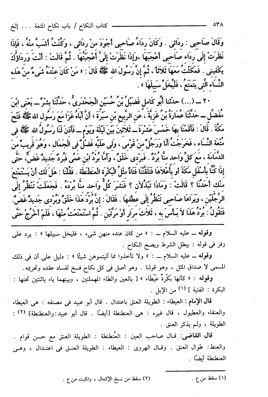 20 - (...) حدَّثنا أَبُو كَامِلٍ فَضَيْلُ بْنُ حُسَيْنٍ الْجَحْدَرِىُّ، حَدَّثَنَا بِشْرٌ - يَعْنِى ابْنَ مُفَضَّلٍ - حَدَّثَنَا عُمَارَةُ بْنُ غُزِيَّةَ، عَنِ الرَّبِيعِ بْنِ سَبْرَةَ؛ أَنَّ أَبَاهُ غَزَا مَعَ رَسُولِ اللهِ صَلَّى اللهُ عَلَيْهِ وَسَلَّمَ فَتْحَ مَكَّةَ. قَالَ: فَأَقَمْنَا بِهَا خَمْسَ عَشْرَةَ - ثَلَاثِينَ بَيْنَ لَيْلَةٍ وَيَوْمٍ - فَأَذِنَ لَنَا رَسُولُ اللهِ صَلَّى اللهُ عَلَيْهِ وَسَلَّمَ فِى مُتْعَةِ النِّسَاءِ، فَخَرَجْتُ أَنَا وَرَجُلٌ مِنْ قَوْمِى، وَلِى عَلَيْهِ فَضْلٌ فِى الْجَمَالِ، وَهُوَ قَرِيبٌ مِنَ الدَّمَامَةِ، مَعَ كُلِّ وَاحِدٍ مِنَّا بُرْدٌ. فَبرْدِى خَلَقٌ، وَأَمَّا بُرْدُ ابْنِ عَمِّى فَبُردٌ جَدِيدٌ غَضٌّ، حَتَّى إِذَا كُنَّا بِأَسْفَلِ مَكَّةَ أَوْ بِأَعْلَاهَا فَتَلَقَّتْنَا فَتَاةٌ مِثْلُ الْبَكْرَةِ الْعنَطْنَطَةِ. فَقُلْنَا: هَل لَكِ أَنْ يَسْتَمْتِعَ مِنْكِ أَحَدُنَا؟ قَالَتْ: وَمَاذَا تَبْذُلَانِ؟ فَنَشَرَ كُلُّ وَاحِدٍ مِنَّا بُرْدَهُ. فَجَعَلَتْ تَنْظُرُ إِلَى الرَّجُلَيْنِ، وَيَرَاهَا صَاحِبِى تَنْظُرُ إِلَى عَطْفِهَا. فَقَالَ: إِنَّ بُرْدَ هَذَا خَلَقٌ وَبُرْدِى جَدِيدٌ غَضٌّ فَتَقُولُ: بُرْدُ هَذَا لَا بَأسَ بِهِ، ثَلَاثَ مِرَارٍ أَوْ مَرَّتَيْنِ. ثُمَّ اسْتَمْتَعْتُ مِنْهَا، فَلَمْ أَخْرُجْ حَتَّى