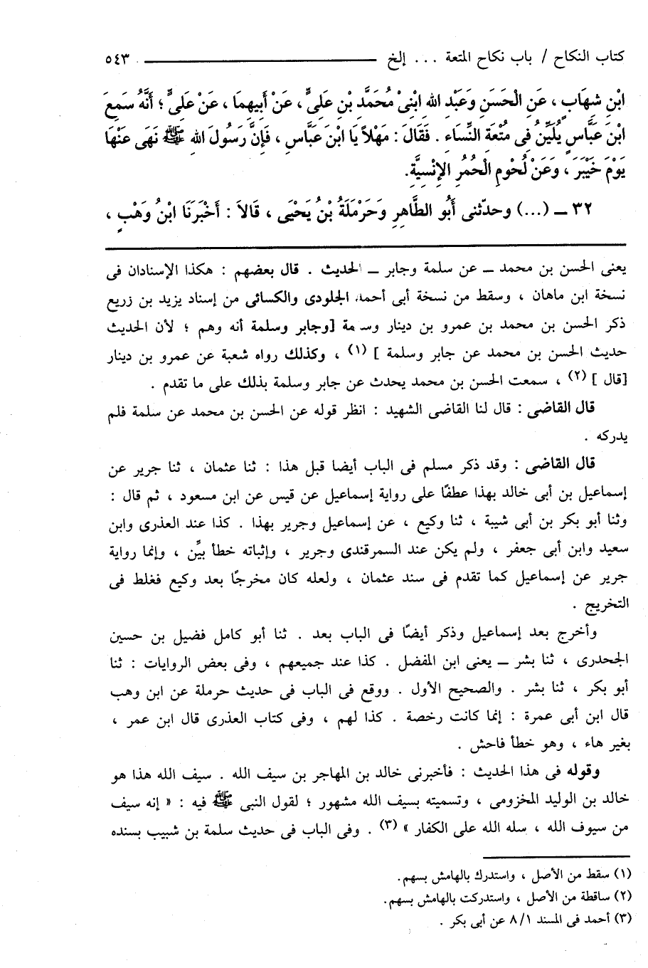 قال القاضى: وقد ذكر مسلم فى الباب أيضاً قبل هذا: ثنا عثمان، ثنا جرير عن إسماعيل بن أبى خالد بهذا عطفًا على رواية إسماعيل عن قيس عن ابن مسعود، ثم قال: وثنا أبو بكر بن أبى شيبة، ثنا وكيع، عن إسماعيل وجرير بهذا. كذا عند العذرى وابن سعيد وابن أبى جعفر، ولم يكن عند السمرقندى وجرير، وإثباته خطأ بيِّن، وإنما رواية جرير عن إسماعيل كما تقدم فى سند عثمان، ولعله كان مخرجًا بعد وكيع فغلط فى التخريج.
