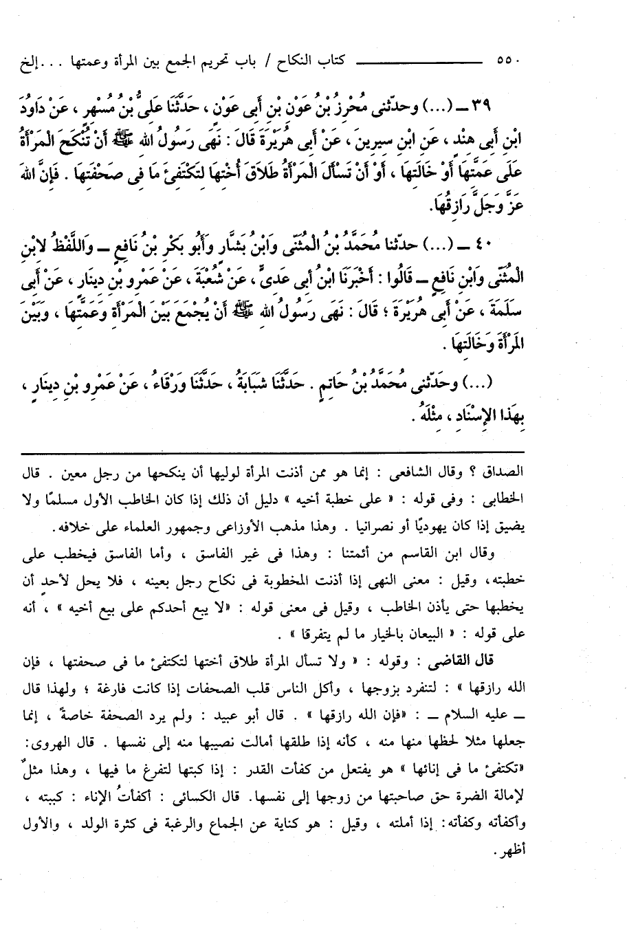 40 - (...) حدّثنا مُحَمَّدُ بْنُ الْمُثَنَّى وَابْنُ بَشَّارٍ وَأَبُو بَكْرِ بْنُ نَافِعٍ - وَاللَّفْظُ لابْنِ الْمُثَنَّى وَابْنِ نَافِعٍ - قَالُوا: أَخْبَرَنَا ابْنُ أَبِى عَدِىٍّ، عَنْ شُعْبَةَ، عَنْ عَمْرِو بْنِ دِينَارٍ، عَنْ أَبِى سَلَمَةَ، عَنْ أَبِى هُرَيْرَةَ؛ قَالَ: نَهَى رسُولُ اللهِ صَلَّى اللهُ عَلَيْهِ وَسَلَّمَ أَنْ يُجْمَعَ بَيْنَ الْمَرْأَةِ وَعَمَّتِهَا، وَبيْنَ المَرْأَة وَخَالَتِهَا.