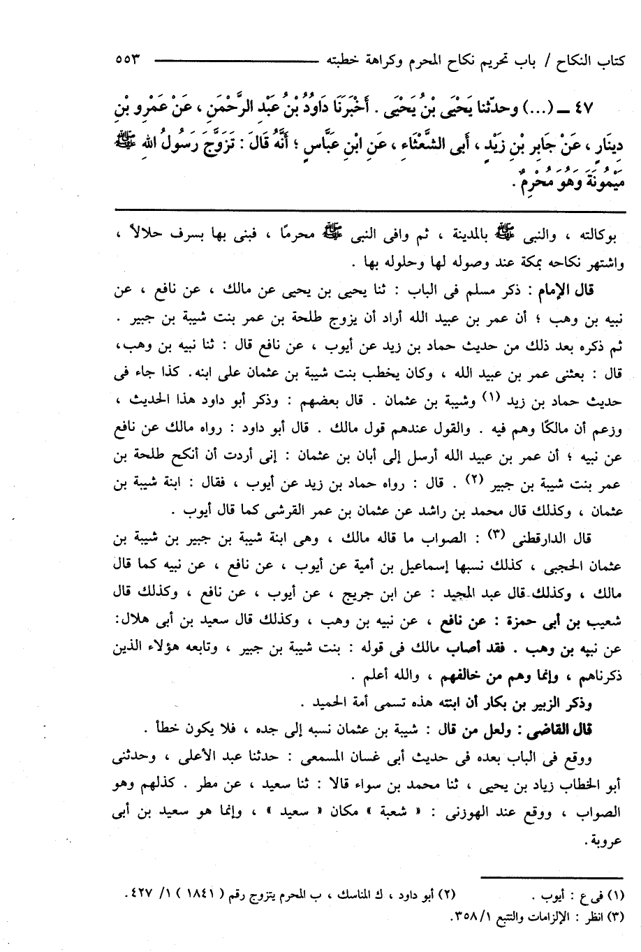 قال الإمام: ذكر مسلم فى الباب: ثنا يحيى بن يحيى عن مالك، عن نافع، عن نبيه بن وهب؛ أن عمر بن عبيد الله أراد أن يزوج طلحة بن عمر بنت شيبة بن جبير. ثم ذكره بعد ذلك من حديث حماد بن زيد عن أيوب، عن نافع قال: ثنا نبيه بن وهب، قال: بعثنى عمر بن عبيد الله، وكان يخطب بنت شيبة بن عثمان على ابنه. كذا جاء فى حديث حماد بن زيد (¬1) وشيبة بن عثمان. قال بعضهم: وذكر أبو داود هذا الحديث، وزعم أن مالكًا وهم فيه. والقول عندهم قول مالك. قال أبو داود: رواه مالك عن نافع عن نبيه؛ أن عمر بن عبيد الله أرسل إلى أبان بن عثمان: إنى أردت أن أنكح طلحة بن عمر بنت شيبة بن جبير (¬2). قال: رواه حماد بن زيد عن أيوب، فقال: ابنة شيبة بن عثمان، وكذلك قال محمد بن راشد عن عثمان بن عمر القرشى كما قال أيوب.