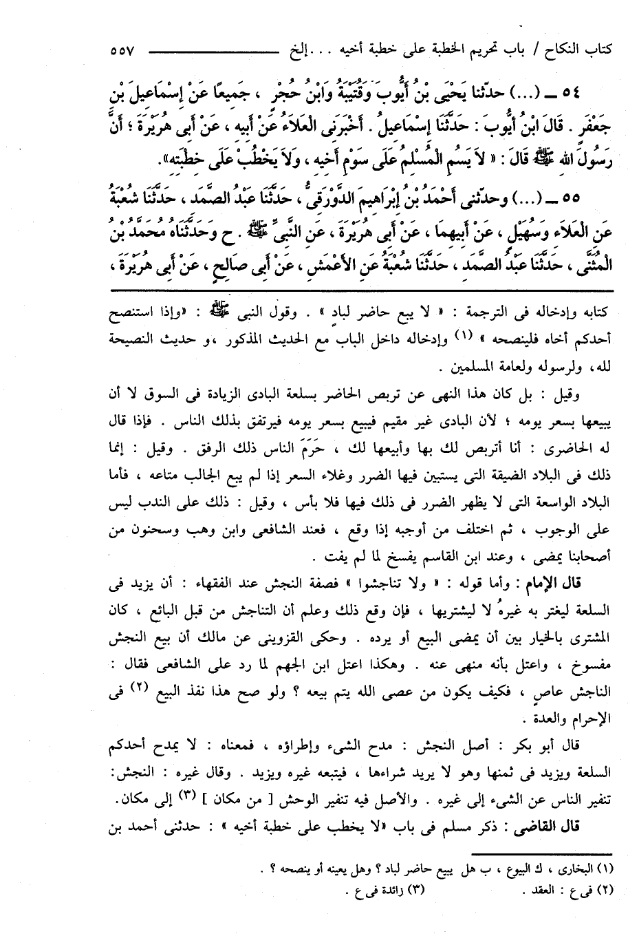 54 - (...) حدّثنا يَحْيَى بْنُ أَيُّوبَ وَقُتَيْبَةُ وَابْنُ حُجْرٍ، جَمِيعًا عَنْ إِسْمَاعِيلَ بْنِ جَعْفَرٍ. قَالَ ابْنُ أَيُّوبَ: حَدَّثَنَا إِسْمَاعِيلُ. أَخْبَرَنِى الْعَلَاءُ عَنْ أَبِيهِ، عَنْ أَبِى هُرَيْرَةَ؛ أَنَّ رَسُولَ اللهِ صَلَّى اللهُ عَلَيْهِ وَسَلَّمَ قَالَ: " لَا يَسُمِ الْمُسْلِمُ عَلَى سَوْمِ أَخَيهِ، وَلَا يَخْطُبْ عَلَى خِطْبَتِهِ ".