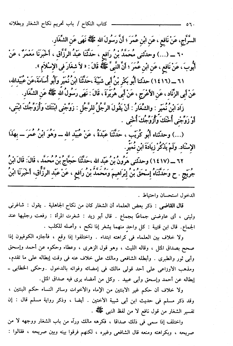 60 - (...) وحدّثنى مُحَمَّدُ بْنُ رَافِعٍ، حَدَّثَنَا عَبْدُ الرَّزَّاقِ، أَخْبَرَنَا مَعْمَرٌ، عَنْ أَيُّوبَ، عَنْ نَافِعٍ، عَنِ ابْنِ عُمَرَ؛ أَنَّ النَّبِىَّ صَلَّى اللهُ عَلَيْهِ وَسَلَّمَ قَالَ: " لَا شِغَارَ فِى الإِسْلَامِ ".