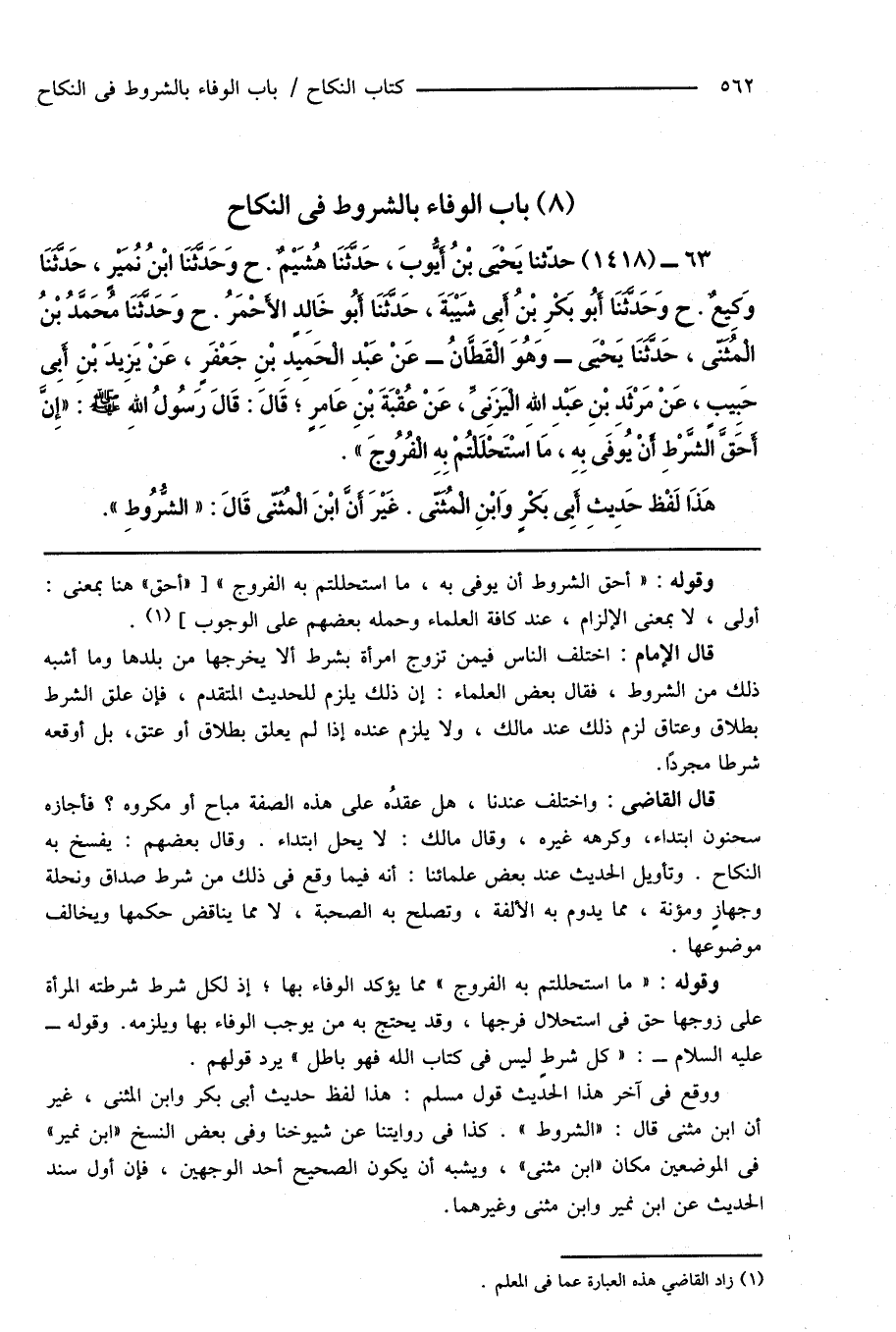 ووقع فى آخر هذا الحديث قول مسلم: هذا لفظ حديث أبى بكر وابن المثنى، غير أن ابن مثنى قال: " الشروط ". كذا فى روايتنا عن شيوخنا وفى بعض النسخ " ابن نمير " فى الموضعين مكان " ابن مثنى "، ويشبه أن يكون الصحيح أحد الوجهين، فإن أول سند الحديث عن ابن نمير وابن مثنى وغيرهما.