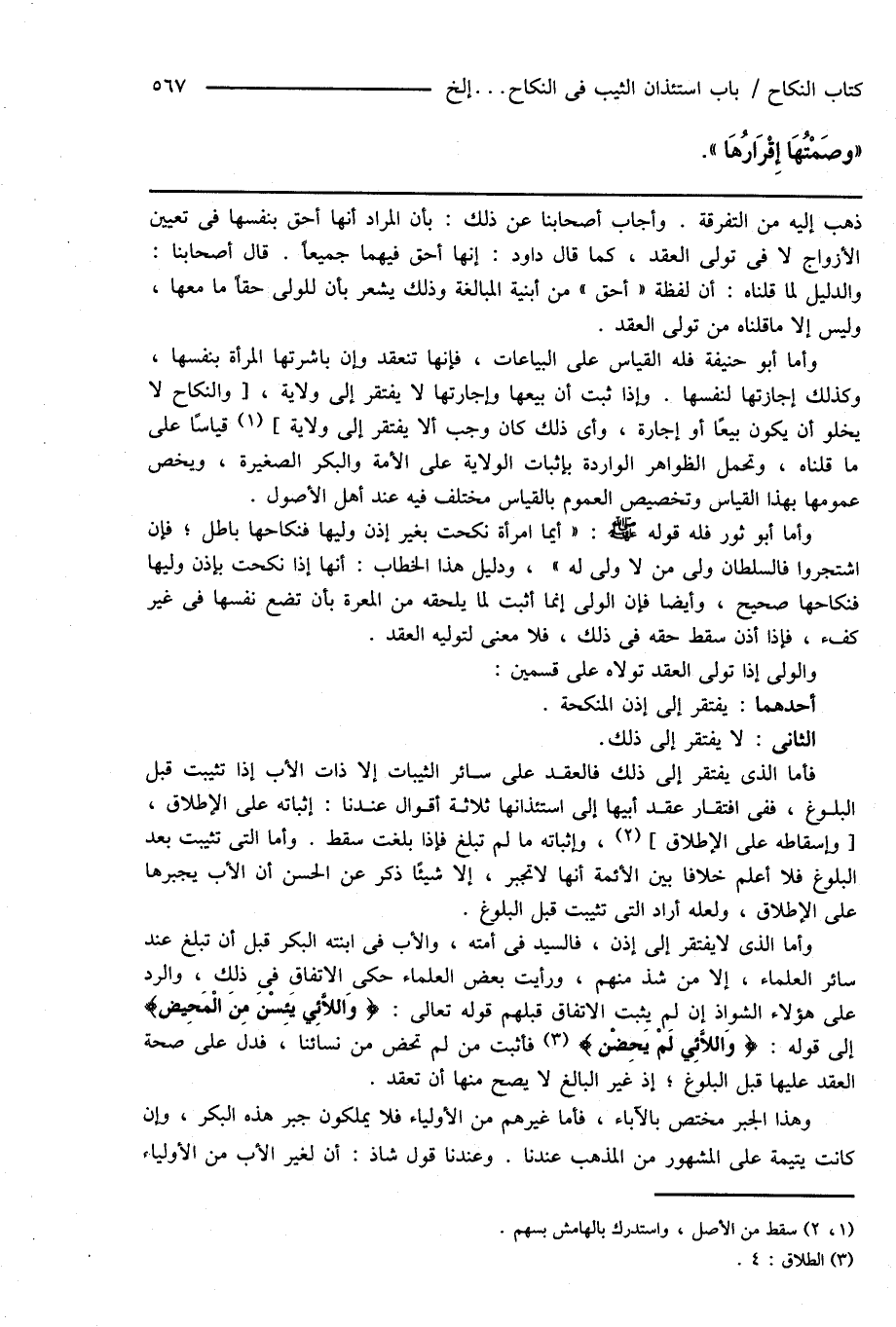 وأما الذى لا يفتقر إلى إذن، فالسيد فى أمته، والأب فى ابنته البكر قبل أن تبلغ عند سائر العلماء، إلا من شذ منهم، ورأيت بعض العلماء حكى الاتفاق فى ذلك، والرد على هؤلاء الشواذ إن لم يثبت الاتفاق قبلهم قوله تعالى: {وَاللَّائِي يَئِسْنَ مِنَ الْمَحِيض} إلى قوله: {وَاللَّائِي لَمْ يَحِضْن} (¬3) فأثبت من لم تحض من نسائنا، فدل على صحة العقد عليها قبل البلوغ؛ إذ غير البالغ لا يصح منها أن تعقد.
