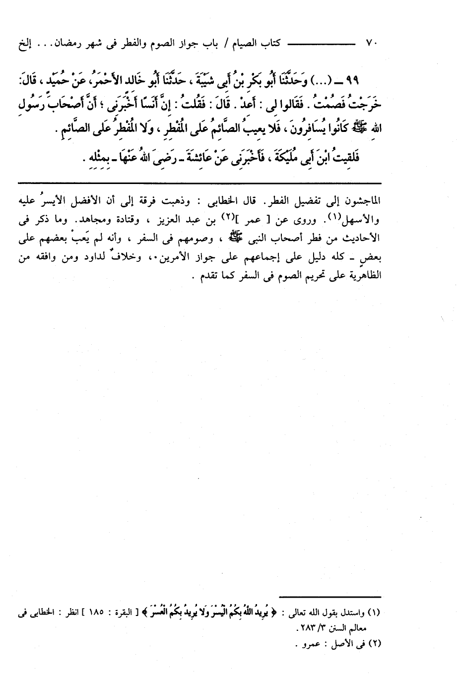 99 - (...) وَحَدَّثَنَا أَبُو بَكْرِ بْنُ أَبِى شَيْبَةَ، حَدَّثَنَا أَبُو خَالِدٍ الأَحْمَرُ، عَنْ حُمَيْدٍ، قَالَ: خَرَجْتُ فَصُمْتُ. فَقَالوا لِى: أَعِدْ. قَالَ: فَقُلْتُ: إِنَّ أَنَسًا أَخْبَرَنِى؛ أَنَّ أَصْحَابَ رَسُولِ اللهِ صَلَّى اللهُ عَلَيْهِ وَسَلَّمَ كَانُوا يُسَافِرُونَ، فَلا يعِيبُ الصَّائِمُ عَلى المُفْطِرِ، وَلا المُفْطِرُ عَلى الصَّائِمِ. فَلقِيتُ ابْنَ أَبِى مُلَيْكَةَ، فَأَخْبَرَنِى عَنْ عَائِشَةَ - رَضِىَ اللهُ عَنْهَا - بِمِثْلِهِ.