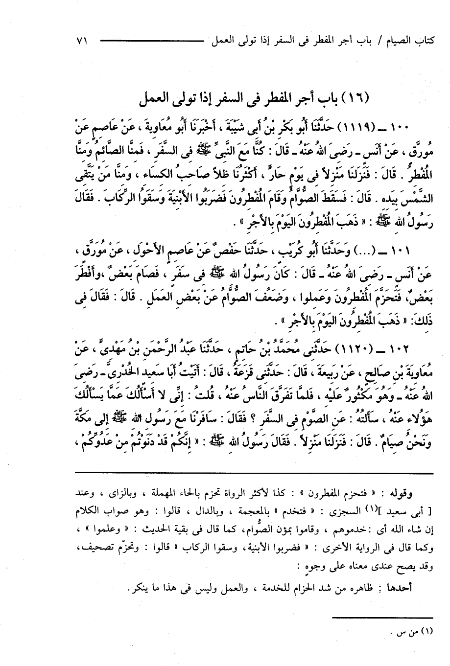 100 - (1119) حَدَّثَنَا أَبُو بَكْرِ بْنُ أَبِى شَيْبَةَ، أَخْبَرَنَا أَبُو مُعَاوِيةَ، عَنْ عَاصِمٍ عَنْ مُورَّقٍ، عَنْ أَنَسٍ - رَضِىَ اللهُ عَنْهُ - قَالَ: كُنَّا مَعَ النَّبِىِّ صَلَّى اللهُ عَلَيْهِ وَسَلَّمَ فِى السَّفَرِ، فَمِنَّا الصَّائِمُ وَمِنَّا المُفْطِرُ. قَالَ: فَنَزَلنَا مَنْزِلاً فِى يَوْمٍ حَارٍّ، أَكْثَرُنَا ظِلاً صَاحِبُ الكِسَاءِ، وَمِنَّا مَنْ يَتَّقِى الشَّمْسَ بِيَدِهِ. قَالَ: فَسَقَطَ الصُّوَّامُ وَقَامَ المُفْطِرُونَ فَضَرَبُوا الأَبْنِيَةَ وَسَقَوُا الرِّكَابَ. فَقَالَ رَسُولُ اللهِ صَلَّى اللهُ عَلَيْهِ وَسَلَّمَ: " ذَهَبَ المُفْطِرُونَ اليَوْمَ بِالأَجْرِ ".