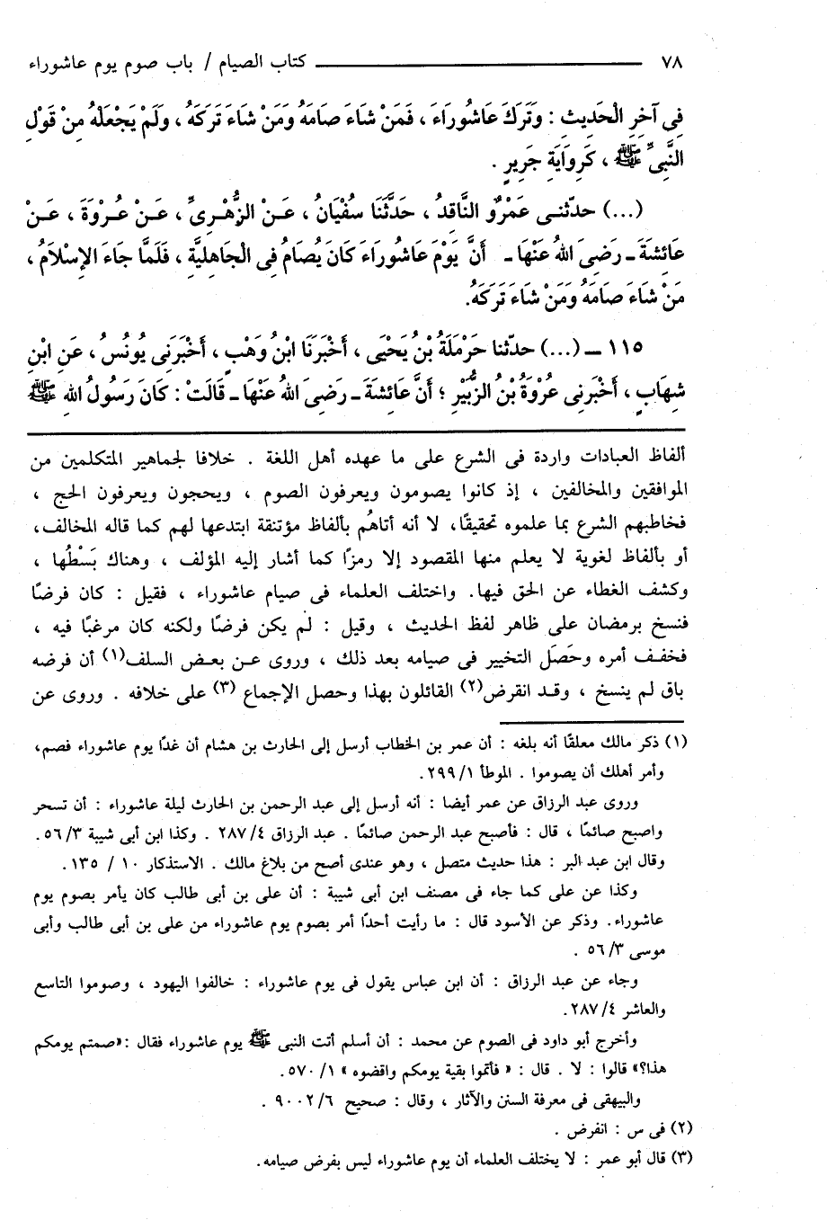 (...) حدَّثنى عَمْرٌو النَّاقِدُ، حَدَّثَنَا سُفْيَانُ، عَنْ الزُّهْرِىِّ، عَنْ عُرْوَةَ، عَنْ عَائِشَةَ - رَضِىَ اللهُ عَنْهَا - أَنَّ يَوْمَ عَاشُورَاءَ كَانَ يُصَامُ فِى الْجَاهِلِيَّةِ، فَلَمَّا جَاءَ الإِسْلَامُ، مَنْ شَاءَ صَامَهُ وَمَنْ شَاءَ تَرَكَهُ.