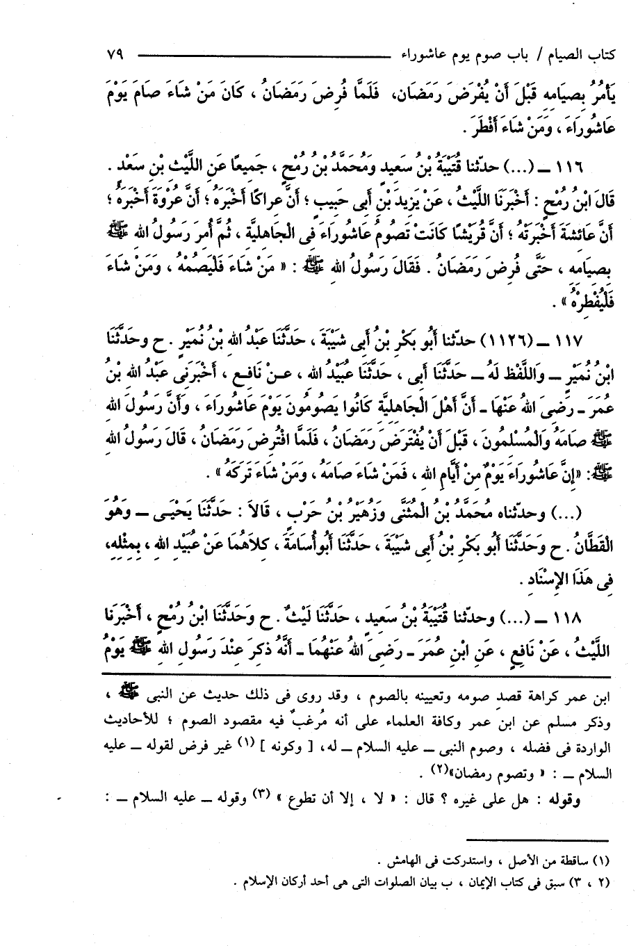 116 - (...) حدَّثنا قُتَيْبَةُ بْنُ سَعِيدٍ وَمُحَمَّدُ بْنُ رُمْحٍ، جَمِيعًا عَنِ اللَّيْثِ بْنِ سَعْدٍ. قَالَ ابْنُ رُمْحٍ: أَخْبَرَنَا اللَّيْثُ، عَنْ يَزِيدَ بْنِ أَبِى حَبِيبٍ؛ أَنَّ عِراكًا أَخْبَرَهُ؛ أَنَّ عُرْوَةَ أَخْبَرَهُ؛ أَنَّ عَائِشَةَ أَخْبَرَتْهُ؛ أَنَّ قُرَيْشًا كَانَتْ تَصُومُ عَاشُورَاءَ فِى الْجَاهِلِيَّةِ، ثُمَّ أُمِرَ رَسُولُ اللهِ صَلَّى اللهُ عَلَيْهِ وَسَلَّمَ بِصِيَامِهِ، حَتَّى فُرِضَ رَمَضَانُ. فَقَالَ رَسُولُ اللهِ صَلَّى اللهُ عَلَيْهِ وَسَلَّمَ: " مَنْ شَاءَ فَلْيَصُمْهُ، وَمَنْ شَاءَ فَلْيُفْطِرْهُ ".