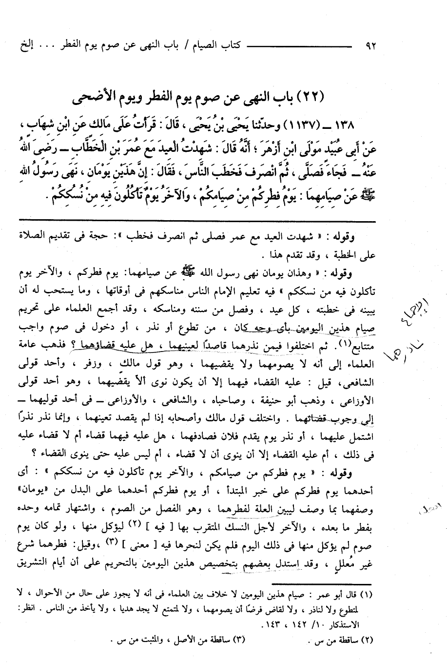 138 - (1137) وحدّثنا يَحْيَى بْنُ يَحْيَى، قَالَ: قَرَأْتُ عَلَى مَالِكٍ عَنِ ابْنِ شِهَابٍ، عَنْ أَبِى عُبَيْدٍ مَوْلَى ابْنِ أَزْهَرَ؛ أَنَّهُ قَالَ: شَهِدْتُ الْعِيدَ مَعَ عُمَرَ بْنِ الْخَطَّابِ - رَضِىَ اللهُ عَنْهُ - فَجَاءَ فَصَلَّى، ثُمَّ انْصَرفَ فَخَطَبَ النَّاسَ، فَقَالَ: إنَّ هَذَيْنِ يَوْمَانِ، نَهَى رَسُولُ اللهِ صَلَّى اللهُ عَلَيْهِ وَسَلَّمَ عَنْ صِيَامِهِمَا: يَوْمُ فِطْرِكُمْ مِنْ صِيَامِكُمْ، وَالآخَرُ يَوْمٌ تَأْكُلُونَ فِيهِ مِنْ نُسُكِكُمْ.