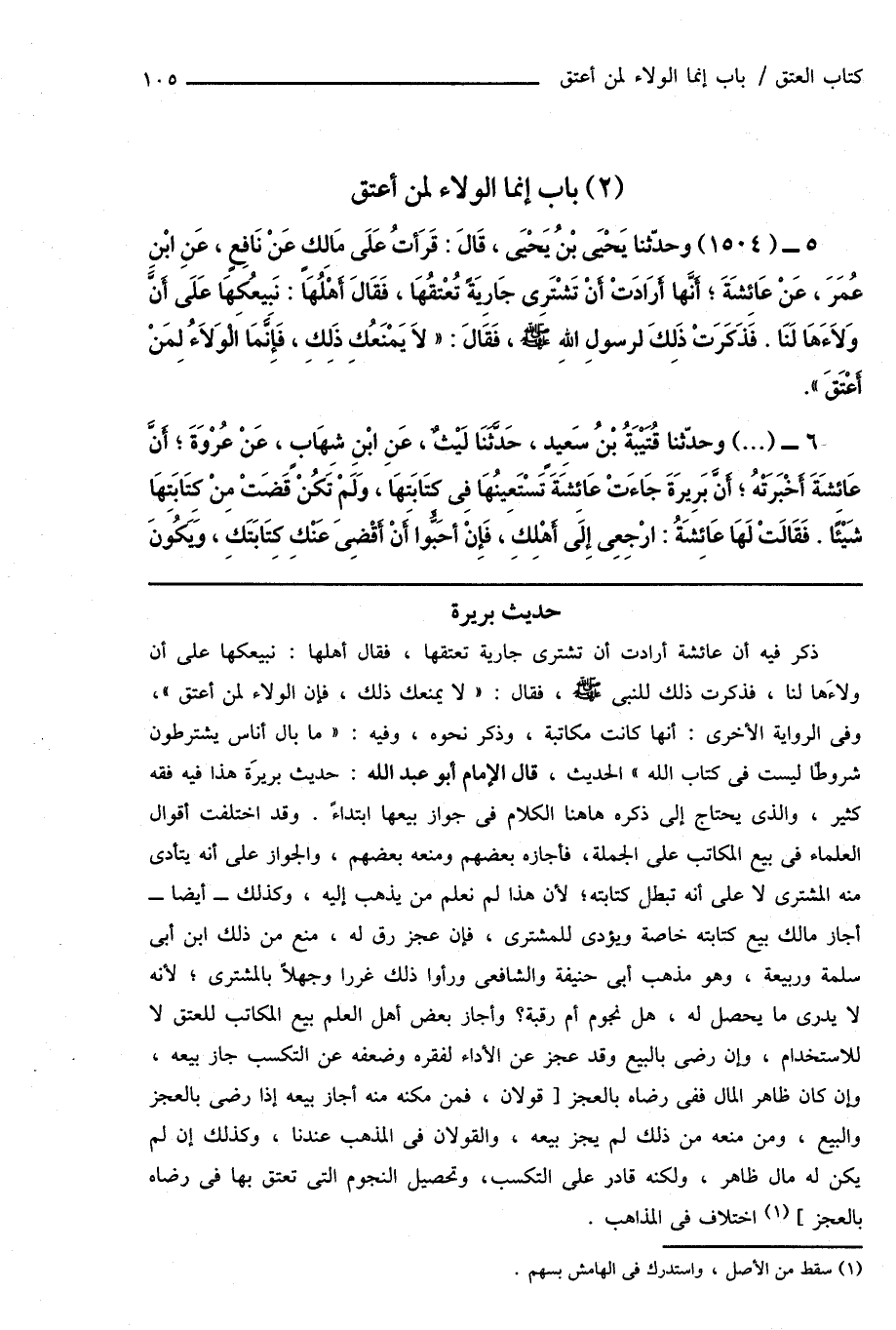 ذكر فيه أن عائشة أرادت أن تشترى جارية تعتقها، فقال أهلها: نبيعكها على أن ولاءَها لنا، فذكرت ذلك للنبى صَلَّى اللهُ عَلَيْهِ وَسَلَّمَ، فقال: " لا يمنعك ذلك، فإن الولاء لمن أعتق "، وفى الرواية الأخرى: أنها كانت مكاتبة، وذكر نحوه، وفيه: " ما بال أناس يشترطون شروطًا ليست فى كتاب الله " الحديث، قال الإمام أبو عبد الله: حديث بريرَة هذا فيه فقه كثير، والذى يحتاج إلى ذكره هاهنا الكلام فى جواز بيعها ابتداءً. وقد اختلفت أقوال العلماء فى بيع المكاتب على الجملة، فأجازه بعضهم ومنعه بعضهم، والجواز على أنه يتأدى منه المشترى لا على أنه تبطل كتابته؛ لأن هذا لم نعلم من يذهب إليه، وكذلك - أيضاً - أجاز مالك بيع كتابته خاصة ويؤدى للمشترى، فإن عجز رق له، منع من ذلك ابن أبى سلمة وربيعة، وهو مذهب أبى حنيفة والشافعى ورأوا ذلك غرراً وجهلاً بالمشترى؛ لأنه لا يدرى ما يحصل له، هل نجوم أم رقبة؟ وأجاز بعض أهل العلم بيع المكاتب للعتق لا للاستخدام، وإن رضى بالبيع وقد عجز عن الأداء لفقره وضعفه عن التكسب جاز بيعه، وإن كان ظاهر المال ففى رضاه بالعجز [قولان، فمن مكنه منه أجاز بيعه إذا رضى بالعجز والبيع، ومن منعه من ذلك لم يجز بيعه، والقولان فى المذهب عندنا، وكذلك إن لم يكن له مال ظاهر، ولكنه قادر على التكسب، وتحصيل النجوم التى تعتق بها فى رضاه بالعجز] (¬1) اختلاف فى المذاهب.