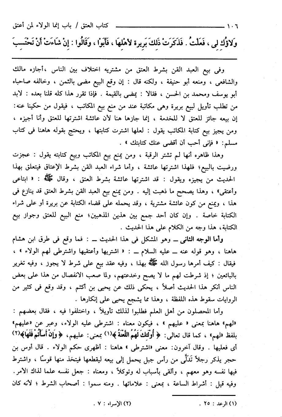 وأما الوجه الثانى - وهو المشكل فى هذا الحديث -: فما وقع فى طرق ابن هشام هاهنا، وهو قوله عنه - عليه السلام -: " اشتريها وأعتقيها واشترطى لهم الولاء "، فيقال: كيف أمرها رسول الله صَلَّى اللهُ عَلَيْهِ وَسَلَّمَ بهذا، وفيه عقد بيع على شرط لا يجوز، وفيه تغرير بالبائعين؛ إذ شرطت لهم ما لا يصح وخدعتهم، ولما صعب الانفصال من هذا على بعض الناس أنكر هذا الحديث أصلاً، يحكى ذلك عن يحيى بن أكثم، وقد وقع فى كثير من الروايات سقوط هذه اللفظة، وهذا مما يشجع يحيى على إنكارها.