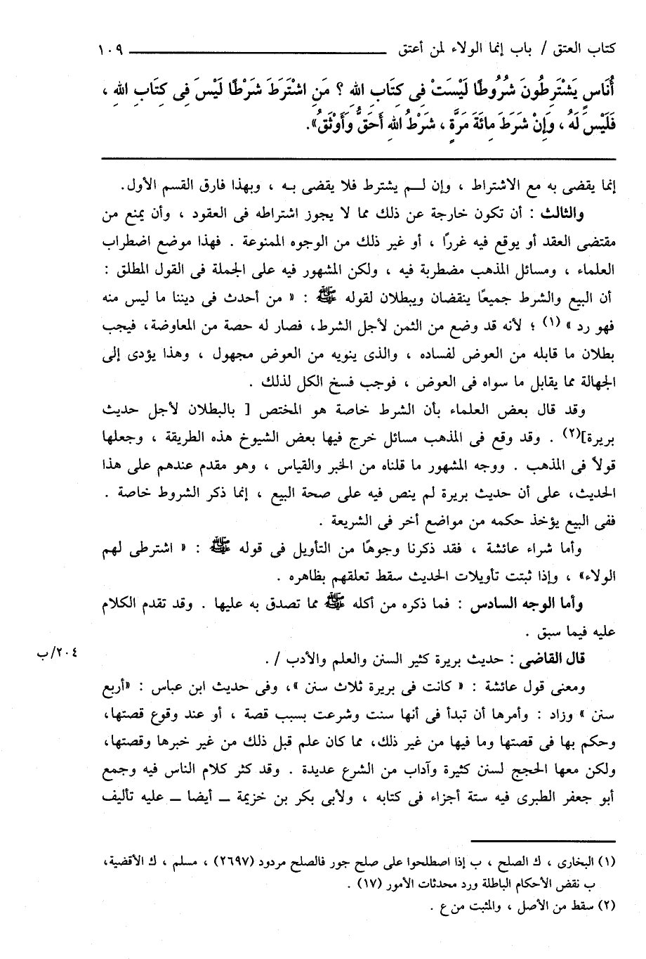 ومعنى قول عائشة: " كانت فى بريرة ثلاث سنن "، وفى حديث ابن عباس: " أربع سنن " وزاد: وأمرها أن تبدأ فى أنها سنت وشرعت بسبب قصة، أو عند وقوع قصتها، وحكم بها فى قصتها وما فيها من غير ذلك، مما كان علم قبل ذلك من غير خبرها وقصتها، ولكن معها الحجج لسنن كثيرة وآداب من الشرع عديدة. وقد كثر كلام الناس فيه وجمع أبو جعفر الطبرى فيه ستة أجزاء فى كتابه، ولأبى بكر بن خزيمة - أيضاً - عليه تأليف