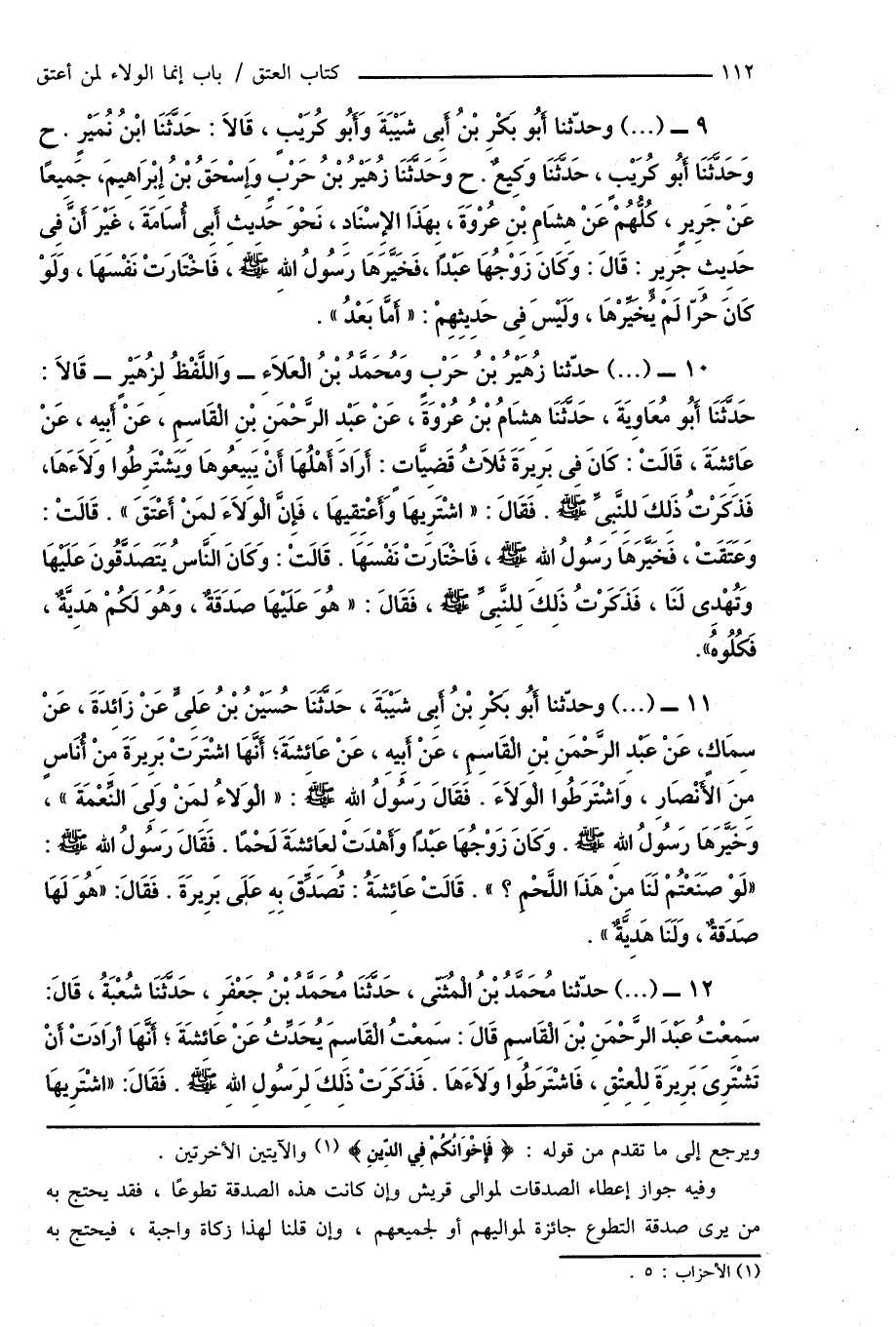 11 - (...) وحدّثنا أَبُو بَكْرِ بْنُ أَبِى شَيْبَةَ، حَدَّثَنَا حُسَيْنُ بْنُ عَلِىٍّ عَنْ زَائِدَةَ، عَنْ سِمَاكٍ، عَنْ عَبْدِ الرَّحْمَنِ بْنِ الْقَاسِمِ، عَنْ أَبِيهِ، عَنْ عَائِشَةَ؛ أَنَّهَا اشْتَرَتْ بَرِيرَةَ منْ أُنَاسٍ مِنَ الأَنْصَارِ، وَاشْتَرَطُوا الْوَلاَءَ. فَقَالَ رَسُوَلُ اللهِ صَلَّى اللهُ عَلَيْهِ وَسَلَّمَ: " الْوَلاءُ لِمَنْ وَلِىَ النِّعْمَةَ "، وَخَيَّرَهَا رَسُولُ اللهِ صَلَّى اللهُ عَلَيْهِ وَسَلَّمَ. وَكَانَ زَوْجُهَا عَبْدًا وَأَهْدَتْ لِعَائِشَةَ لَحْمًا. فَقَالَ رَسُولُ اللهِ صَلَّى اللهُ عَلَيْهِ وَسَلَّمَ: " لَوْ صَنَعْتُمْ لَنَا مِنْ هَذَا اللَّحْمِ؟ ". قَالَتْ عَائِشَةُ: تُصَدِّقَ بِهِ عَلَى بَرِيرَةَ. فَقَالَ: " هُوَ لَهَا صَدَقَةٌ، وَلَنَا هَدِيَّةٌ ".