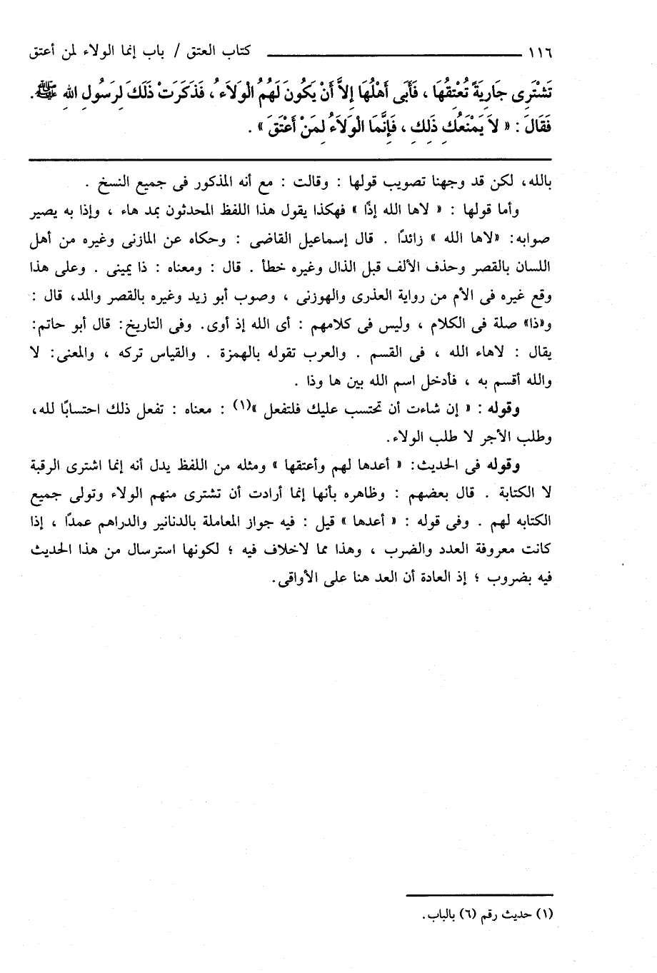 وقوله فى الحديث: " أعدها لهم وأعتقها " ومثله من اللفظ يدل أنه إنما اشترى الرقبة لا الكتابة. قال بعضهم: وظاهره بأنها إنما أرادت أن تشترى منهم الولاء وتولى جميع الكتابه لهم. وفى قوله: " أعدها " قيل: فيه جواز المعاملة بالدنانير والدراهم عمدًا، إذا كانت معروفة العدد والضرب، وهذا مما لاخلاف فيه؛ لكونها استرسال من هذا الحديث فيه بضروب؛ إذ العادة أن العد هنا على الأواقى.