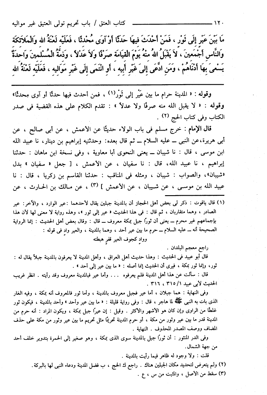 وقوله: " المدينة حرام ما بين عَيْر إلى ثَوْر (¬1)، فمن أحدث فيها حدثًا أو آوى محدثًا " وقوله: " لا يقبل الله منه صرفًا ولا عدلاً ": تقدم الكلام على هذه القضية فى صدر الكتاب وفى كتاب الحج (¬2).