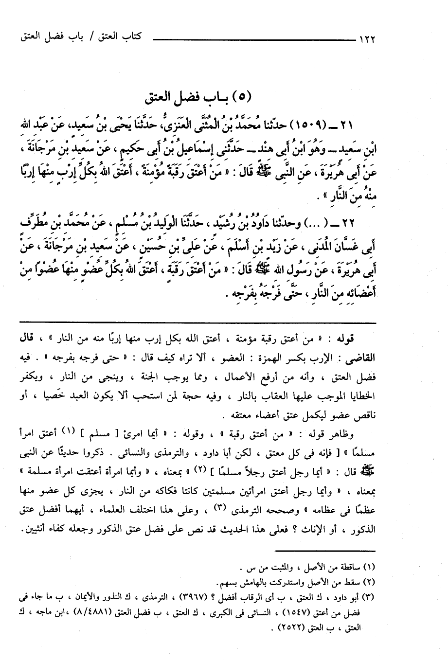 (¬3) أبو داود، ك العتق، ب أى الرقاب أفضل؟ (3967)، الترمذى، ك النذور والأيمان، ب ما جاء فى فضل من أعتق (1547)، النسائى فى الكبرى، ك العتق، ب فضل العتق (4881/ 8)، ابن ماجه، ك العتق، ب العتق (2522).