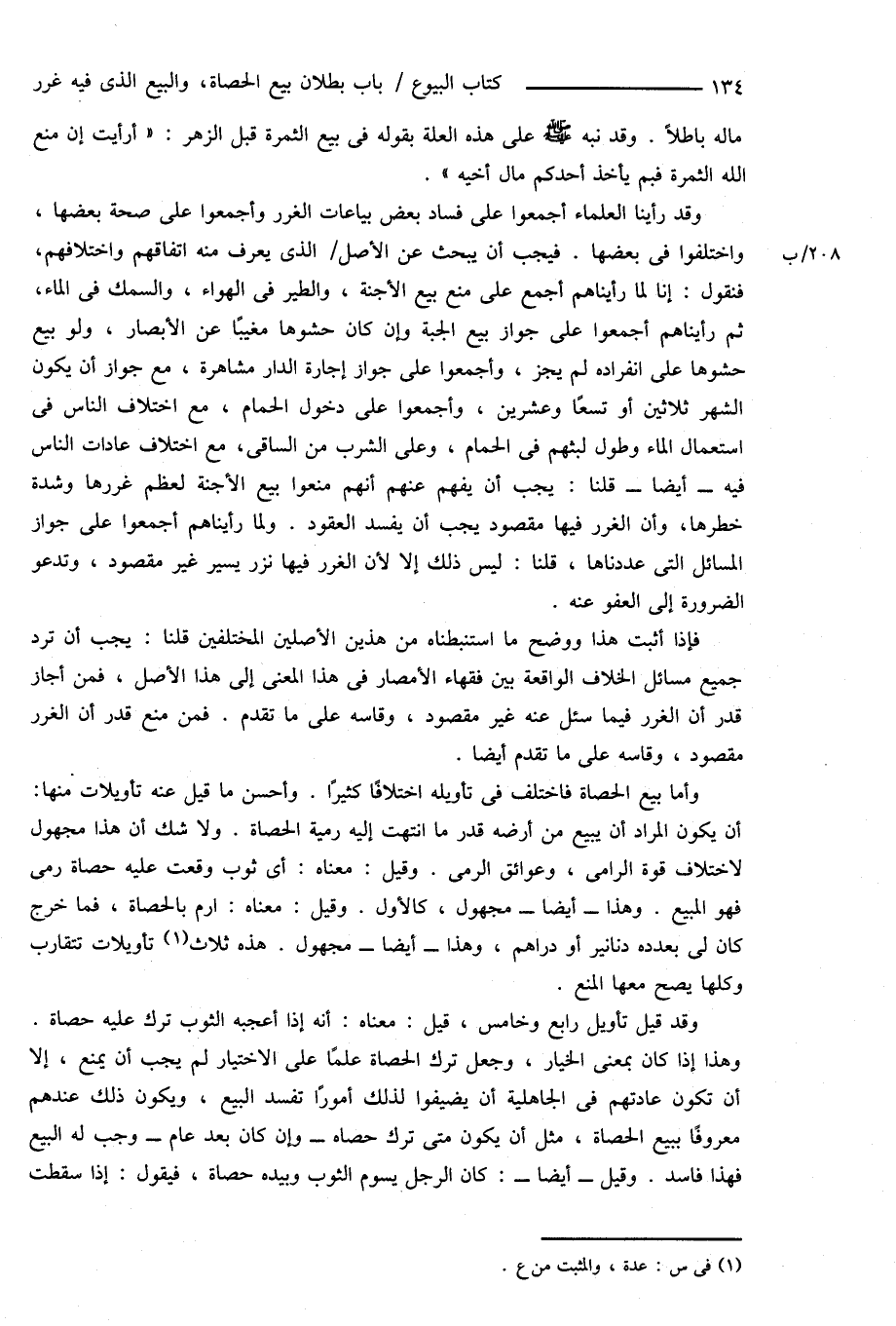 وقد رأينا العلماء أجمعوا على فساد بعض بياعات الغرر وأجمعوا على صحة بعضها، واختلفوا فى بعضها. فيجب أن يبحث عن الأصل الذى يعرف منه اتفاقهم واختلافهم، فنقول: إنا لما رأيناهم أجمع على منع بيع الأجنة، والطير فى الهواء، والسمك فى الماء، ثم رأيناهم أجمعوا على جواز بيع الجبة وإن كان حشوها مغيبًا عن الأبصار، ولو بيع حشوها على انفراده لم يجز، وأجمعوا على جواز إجارة الدار مشاهرة، مع جواز أن يكون الشهر ثلاثين أو تسعًا وعشرين، وأجمعوا على دخول الحمام، مع اختلاف الناس فى استعمال الماء وطول لبثهم فى الحمام، وعلى الشرب من الساقى، مع اختلاف عادات الناس فيه - أيضاً - قلنا: يجب أن يفهم عنهم أنهم منعوا بيع الأجنة لعظم غررها وشدة خطرها، وأن الغرر فيها مقصود يجب أن يفسد العقود. ولما رأيناهم أجمعوا على جواز المسائل التى عددناها، قلنا: ليس ذلك إلا لأن الغرر فيها نزر يسير غير مقصود، وتدعو الضرورة إلى العفو عنه.