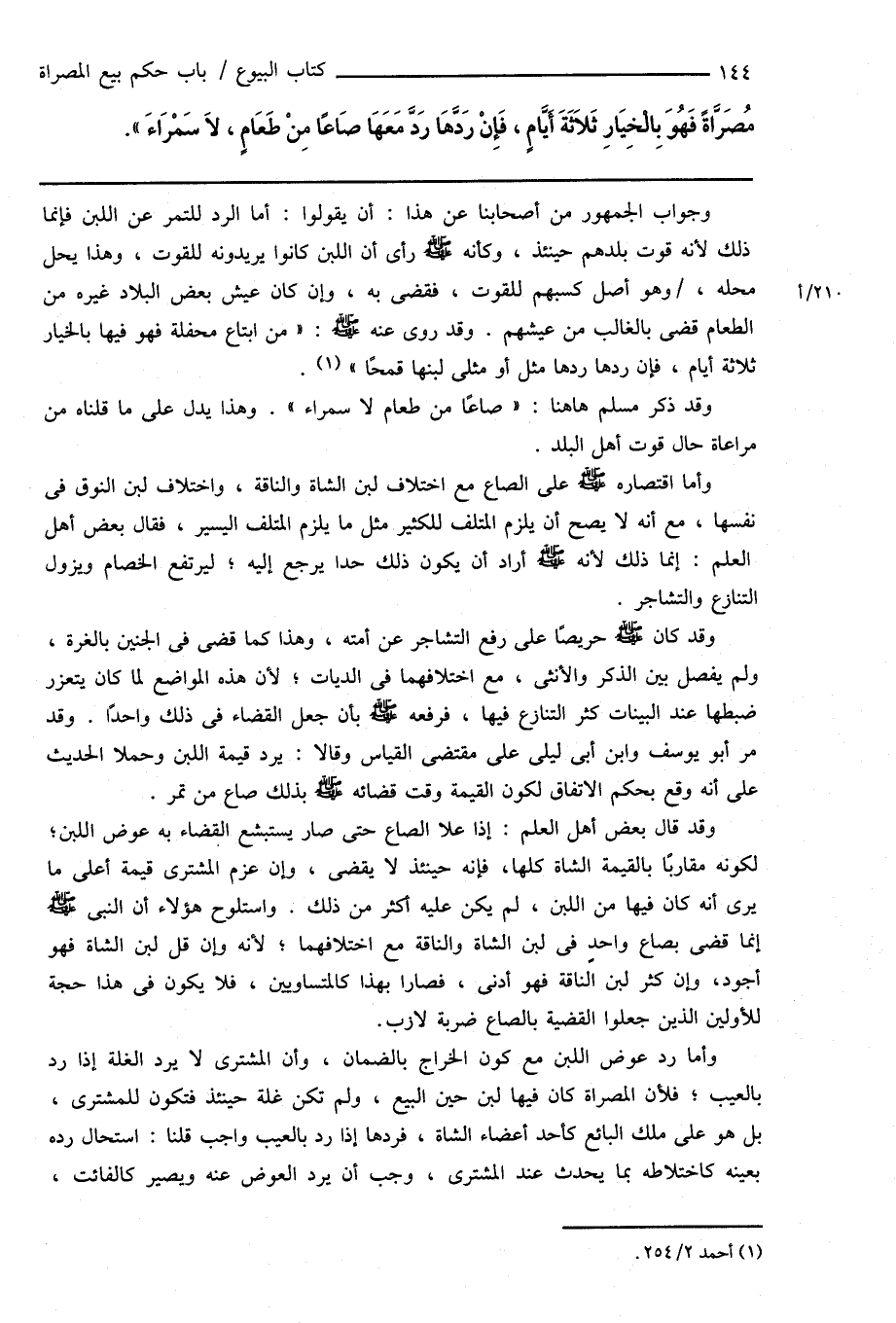 وقد كان صَلَّى اللهُ عَلَيْهِ وَسَلَّمَ حريصًا على رفع التشاجر عن أمته، وهذا كما قضى فى الجنين بالغرة، ولم يفصل بين الذكر والأنثى، مع اختلافهما فى الديات؛ لأن هذه المواضع لما كان يتعزر ضبطها عند البينات كثر التنازع فيها، فرفعه صَلَّى اللهُ عَلَيْهِ وَسَلَّمَ بأن جعل القضاء فى ذلك واحدًا. وقد مر أبو يوسف وابن أبى ليلى على مقتضى القياس وقالا: يرد قيمة اللبن وحملا الحديث على أنه وقع بحكم الاتفاق لكون القيمة وقت قضائه صَلَّى اللهُ عَلَيْهِ وَسَلَّمَ بذلك صاع من تمر.