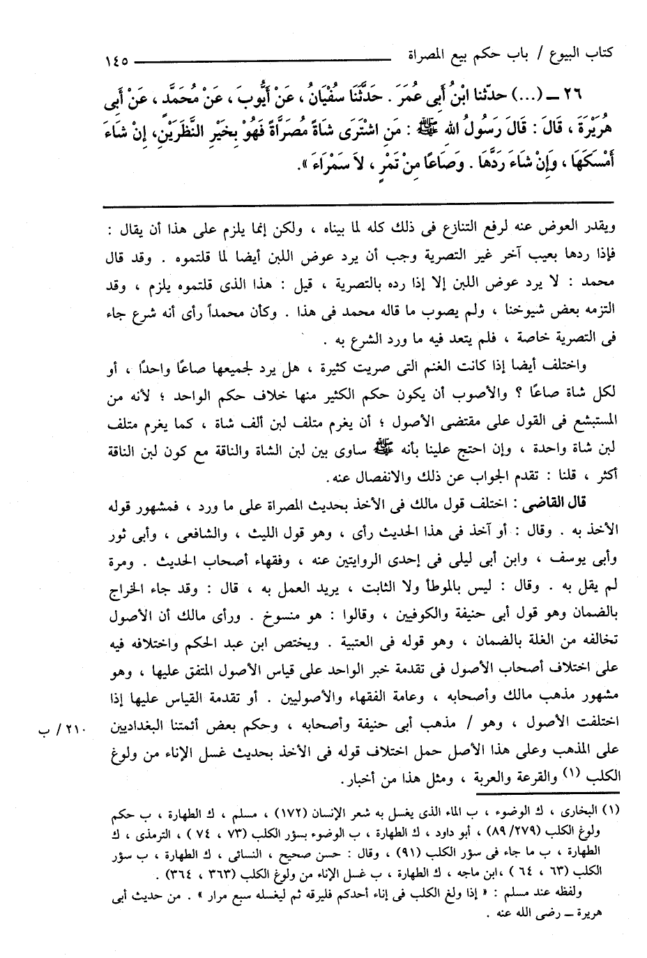 قال القاضى: اختلف قول مالك فى الأخذ بحديث المصراة على ما ورد، فمشهور قوله الأخذ به. وقال: أو آخذ فى هذا الحديث رأى، وهو قول الليث، والشافعى، وأبى ثور وأبى يوسف، وابن أبى ليلى فى إحدى الروايتين عنه، وفقهاء أصحاب الحديث. ومرة لم يقل به. وقال: ليس بالموطأ ولا الثابت، يريد العمل به، قال: وقد جاء الخراج بالضمان وهو قول أبى حنيفة والكوفيين، وقالوا: هو منسوخ. ورأى مالك أن الأصول تخالفه من الغلة بالضمان، وهو قوله فى العتبية. ويختص ابن عبد الحكم واختلافه فيه على اختلاف أصحاب الأصول فى تقدمة خبر الواحد على قياس الأصول المتفق عليها، وهو مشهور مذهب مالك وأصحابه، وعامة الفقهاء والأصوليين. أو تقدمة القياس عليها إذا اختلفت الأصول، وهو مذهب أبى حنيفة وأصحابه، وحكم بعض أئمتنا البغداديين على المذهب وعلى هذا الأصل حمل اختلاف قوله فى الأخذ بحديث غسل الإناء من ولوغ الكلب (¬1) والقرعة والعربة، ومثل هذا من أخبار.