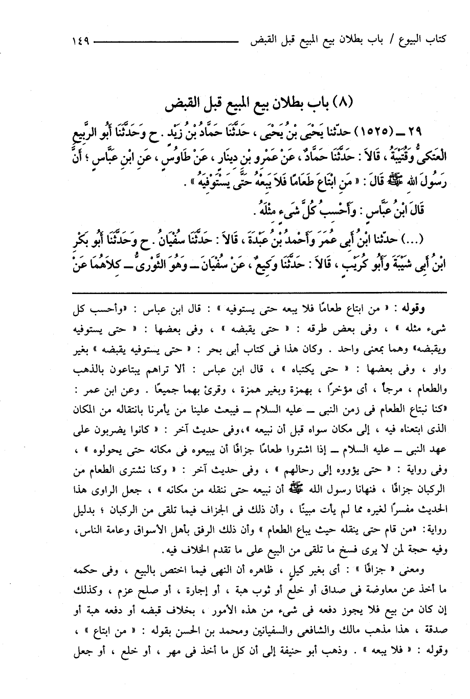 29 - (1525) حدّثنا يَحْيَى بْنُ يَحْيَى، حَدَّثَنَا حَمَّادُ بْنُ زَيْدٍ. ح وَحَدَّثَنَا أَبُو الرَّبِيعِ الْعَتكىُّ وَقُتَيْبَةُ، قَالَا: حَدَّثَنَا حَمَّادٌ، عَنْ عَمْرِو بْنِ دِينَارٍ، عَنْ طَاوُسٍ، عَنِ ابْنِ عَبَّاسٍ؛ أَنَّ رَسُولَ اللهِ صَلَّى اللهُ عَلَيْهِ وَسَلَّمَ قَالَ: " مَنِ ابْتَاعَ طَعَامًا فَلَا يَبِعْهُ حَتَّى يَسْتَوفِيَهُ ". قَالَ ابْنُ عَبَّاسٍ: وَأَحْسِبُ كُلَّ شَىءٍ مِثْلَهُ.