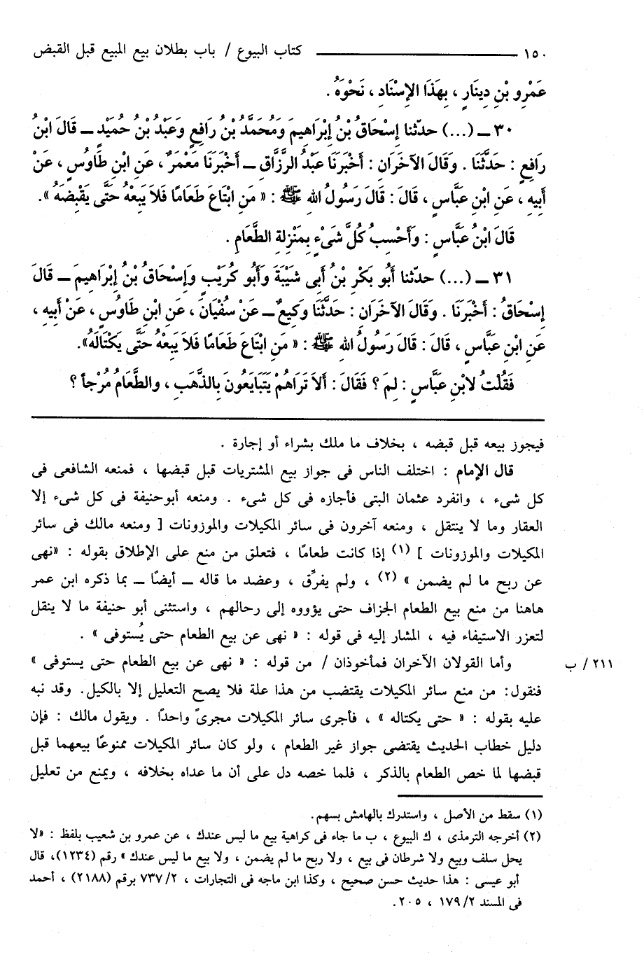 31 - (...) حدّثنا أَبُو بَكْرِ بْنُ أَبِى شَيْبَةَ وَأَبُو كُرَيْبٍ وَإِسْحَاقُ بْنُ إِبْرَاهِيمَ - قَالَ إِسْحَاقُ: أَخْبَرَنَا. وَقَالَ الآخَرَانِ: حَدَّثَنَا وَكِيعٌ - عَنْ سُفْيَانَ، عَنِ ابْنِ طَاوُسٍ، عَنْ أَبِيهِ، عَنِ ابْنِ عَبَّاسٍ، قَالَ: قَالَ رَسُولُ اللهِ صَلَّى اللهُ عَلَيْهِ وَسَلَّمَ: " مَنِ ابْتَاعَ طَعَامًا فَلَا يَبِعْهُ حَتَّى يَكْتَالَهُ ".